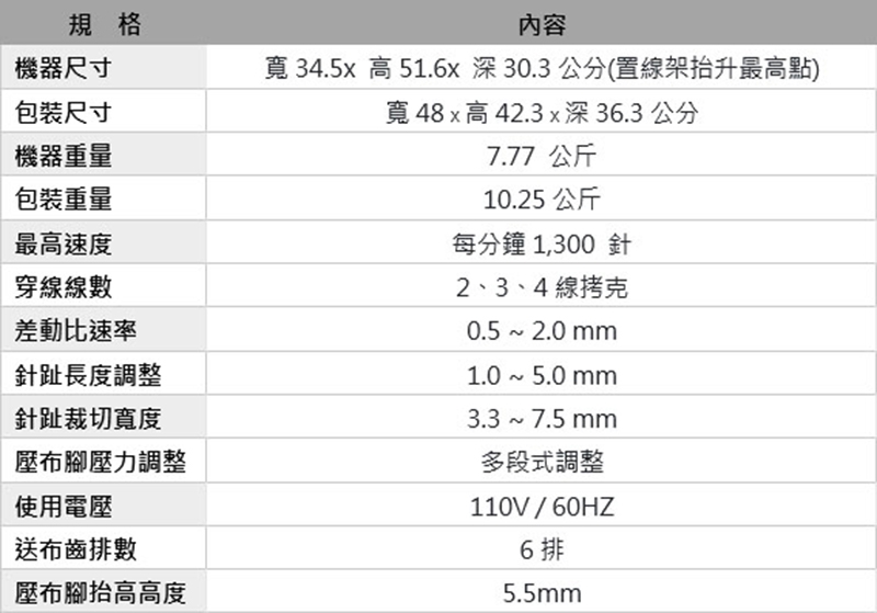 | 縫紉速度 | 最高值700以上 |