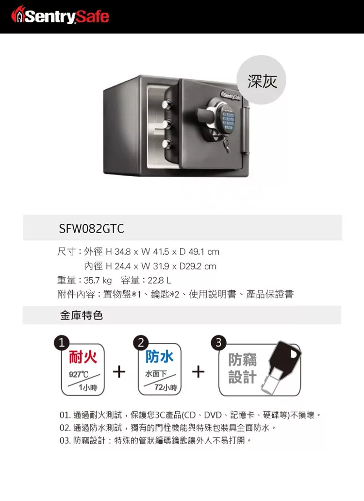 SentrySafe SFW082GTC 保險箱,品牌為SentrySafe,重量約36kg~40kg,提供1年保固(人為損壞不保固,如遺失鑰匙或鑰匙鎖在保險箱內)。適閤家庭使用,防火防水設計,安全儲存貴重物品。