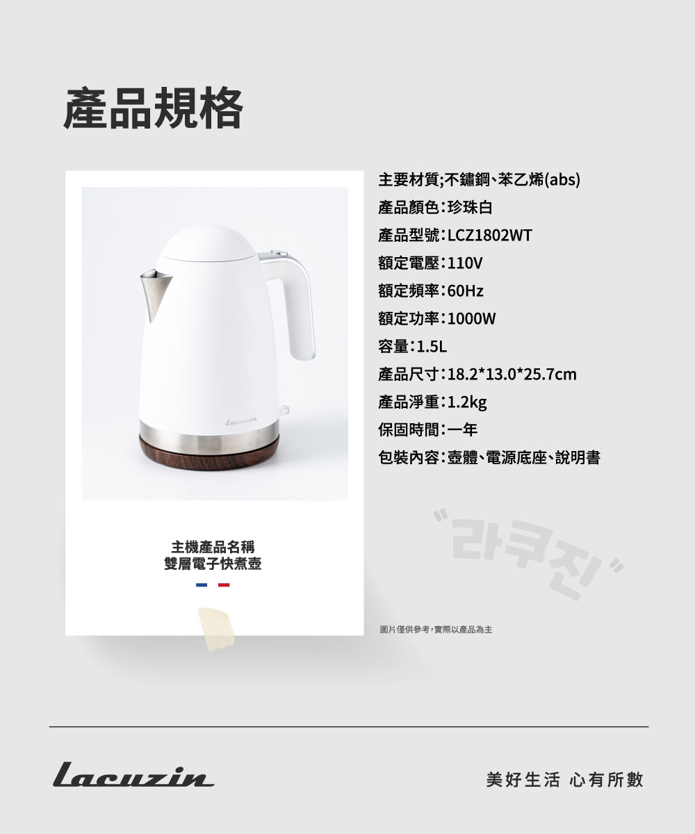 Lacuzin LCZ1802WT 電熱水壺,容量1.8公升,內膽採用304優質不鏽鋼,安全耐用。功率900W~1000W,快速沸騰,適閤家庭或辦公室使用。尺寸約18.2 x 13.0 x 25.7 cm,重量僅1.2 kg,輕巧便攜。電壓110V/60Hz,產地中國,保固1年,並取得臺灣BSMI許可字號R3A903,品質保證,讓您安心煮水。