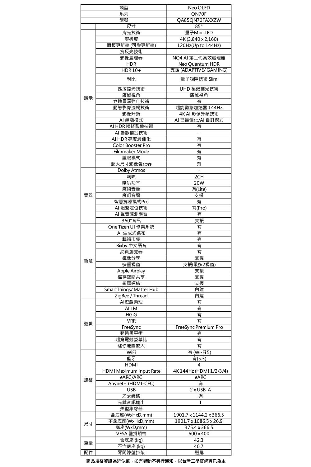 | 型號 | QA85QN70FAXXZW、QA85QN70F、85QN70F |