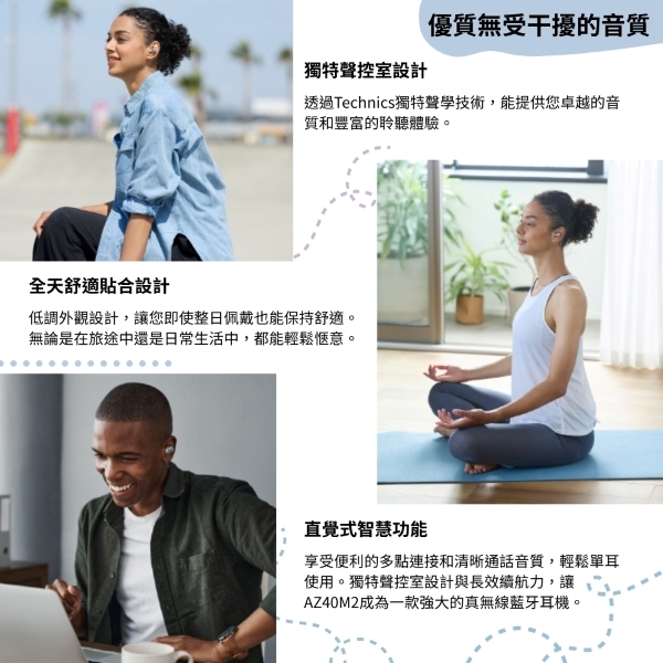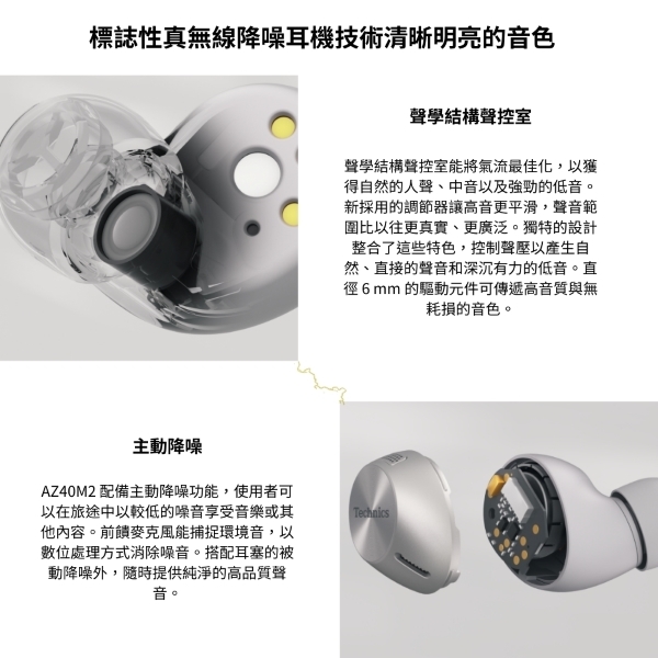 Technics EAH-AZ40M2 真無線藍芽耳塞耳機,採用耳塞式設計,具防潑水功能,無內建麥克風,支援TYPE-C輸入端子。顏色選擇黑色、銀色、玫瑰金,重量僅135g,適用Windows與Android系統。產地馬來西亞,一年保固,NCC認證碼CCAH23LP1280T3,BSMI許可字號R31417。