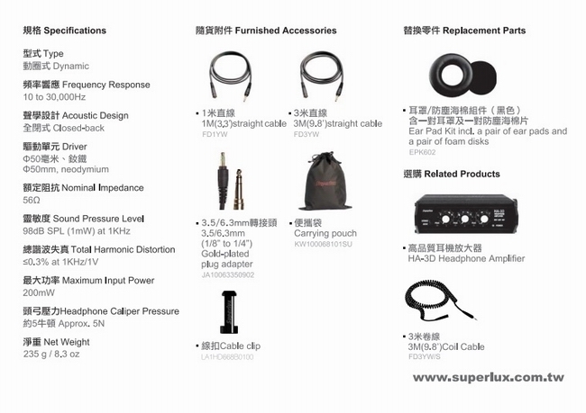 | 包裝內容物 | 耳機,1m連接線,3m連接線,3.5/6.3mm轉接頭,便攜帶,線扣。 |