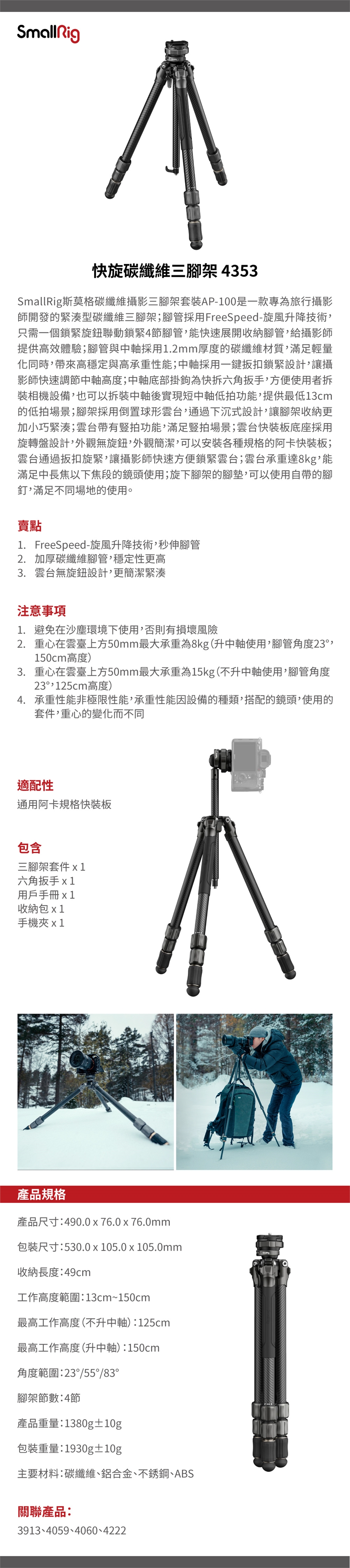 SmallRig 4353 快旋碳纖維三腳架 公司貨