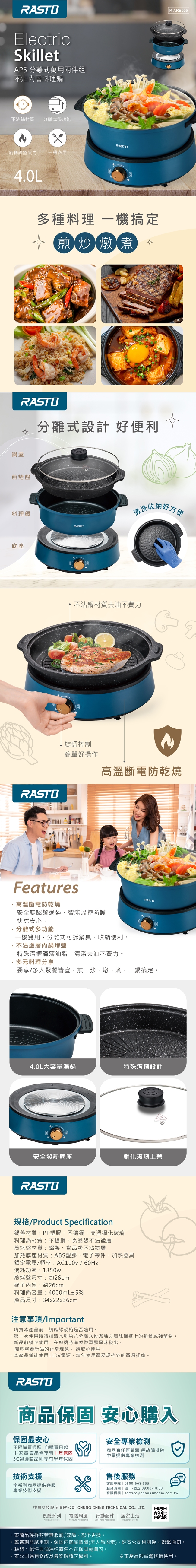 RASTO AP5 電子鍋(型號 R-ARB005)是4人份家用電鍋,採用藍色系設計,內鍋為耐用不鏽鋼材質,尺寸34x22x36cm,重量3.1kg,適合小型家庭使用。支援100V/60Hz電壓,消耗功率1300~1400W,快速煮食米飯與熱菜。產地中國,保固1年,BSMI許可字號R54305。高效節能,安全可靠,是現代廚房的理想選擇。