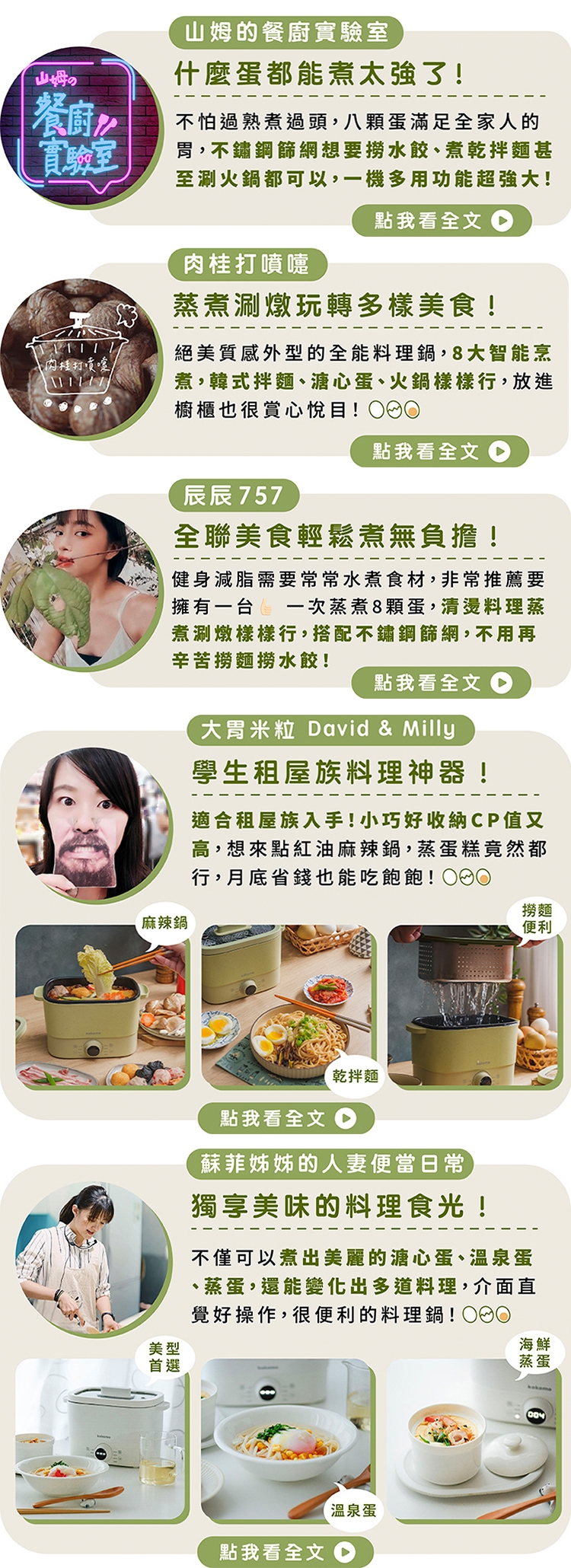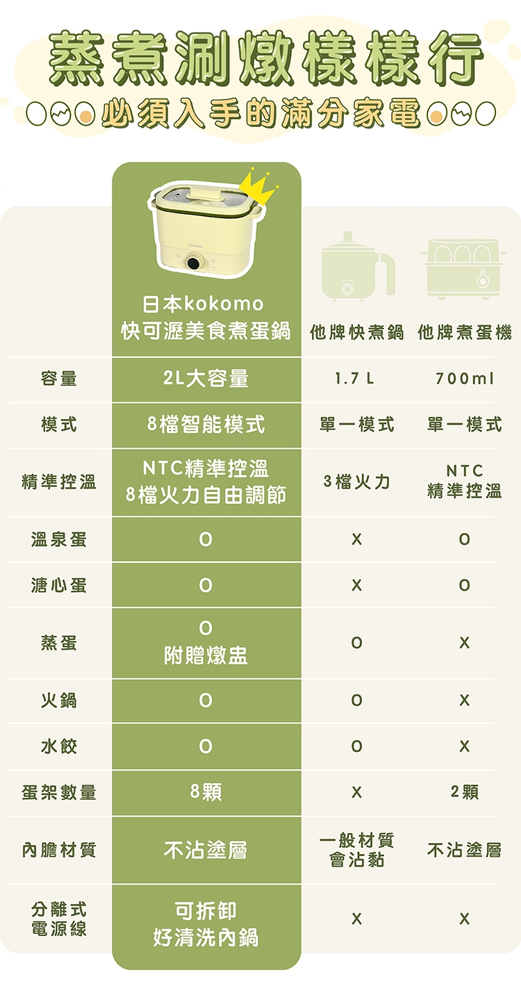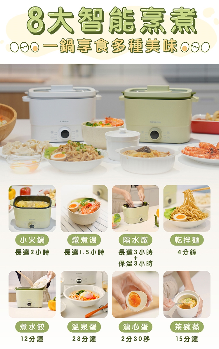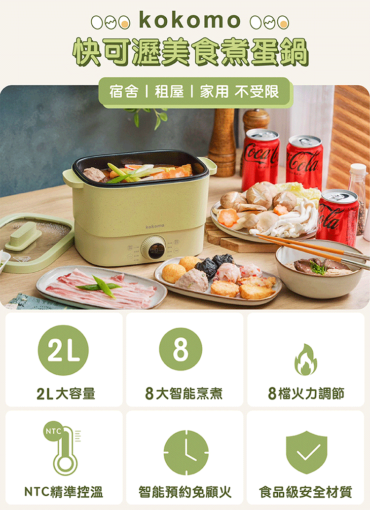 KO-GP2332 快可瀝美食煮蛋鍋,具備8大烹煮功能,可蒸、煮、燉等多種料理方式,內鍋為2公升容量,採用食品級不沾塗層,無油烹調更健康。NTC 8檔火力調節,溫控調整精準,操作簡單。適閤家庭使用,一鍋多用,是煮蛋鍋推薦商品。