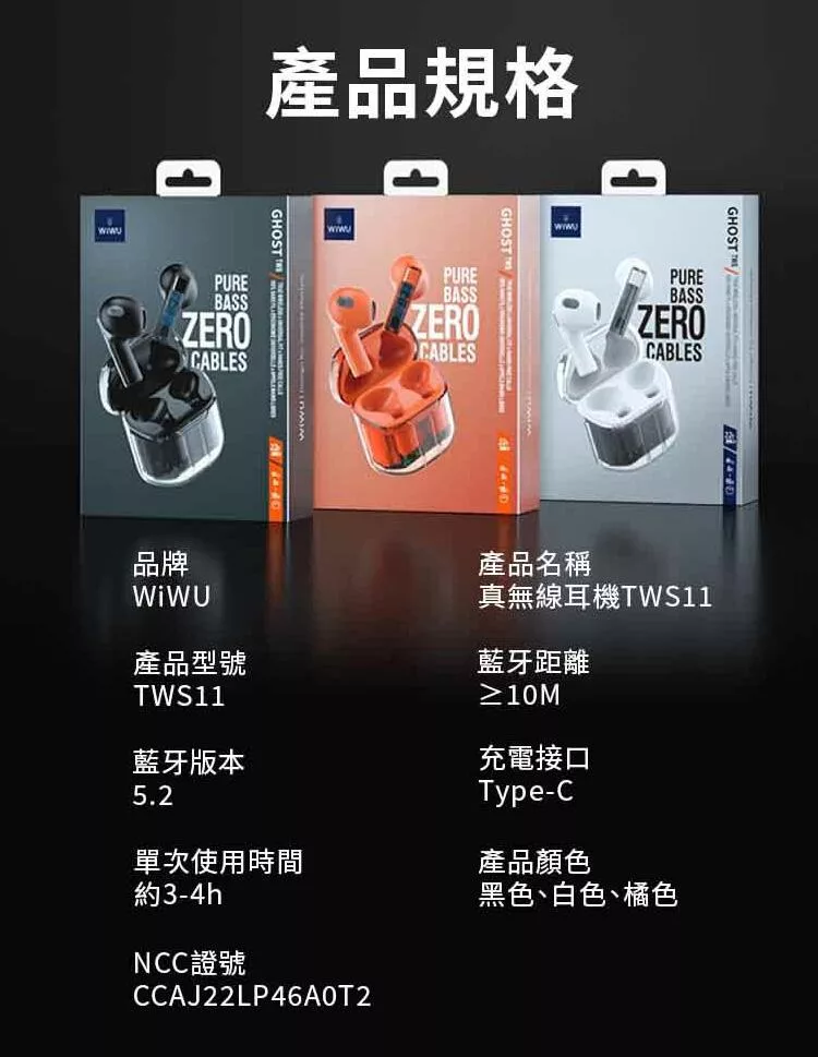WIWU TWS11 真無線藍芽耳機,採用藍芽5.2 技術,提供穩定≥10米連線距離,半入耳式設計舒適不壓耳。內建麥克風支援通話,TYPE-C 充電埠方便快速充電。顏色選擇黑色、白色、橘色,充電盒尺寸約49x48x26mm,重量約300g(含包裝)。適用Android及通用作業系統,產地中國,保固一個月,NCC認證碼CCAJ22LP46A0T2。適合日常通勤、運動使用,享受高品質無線音訊體驗。注意:實際色澤以商品為準,避免高低溫環境使用。