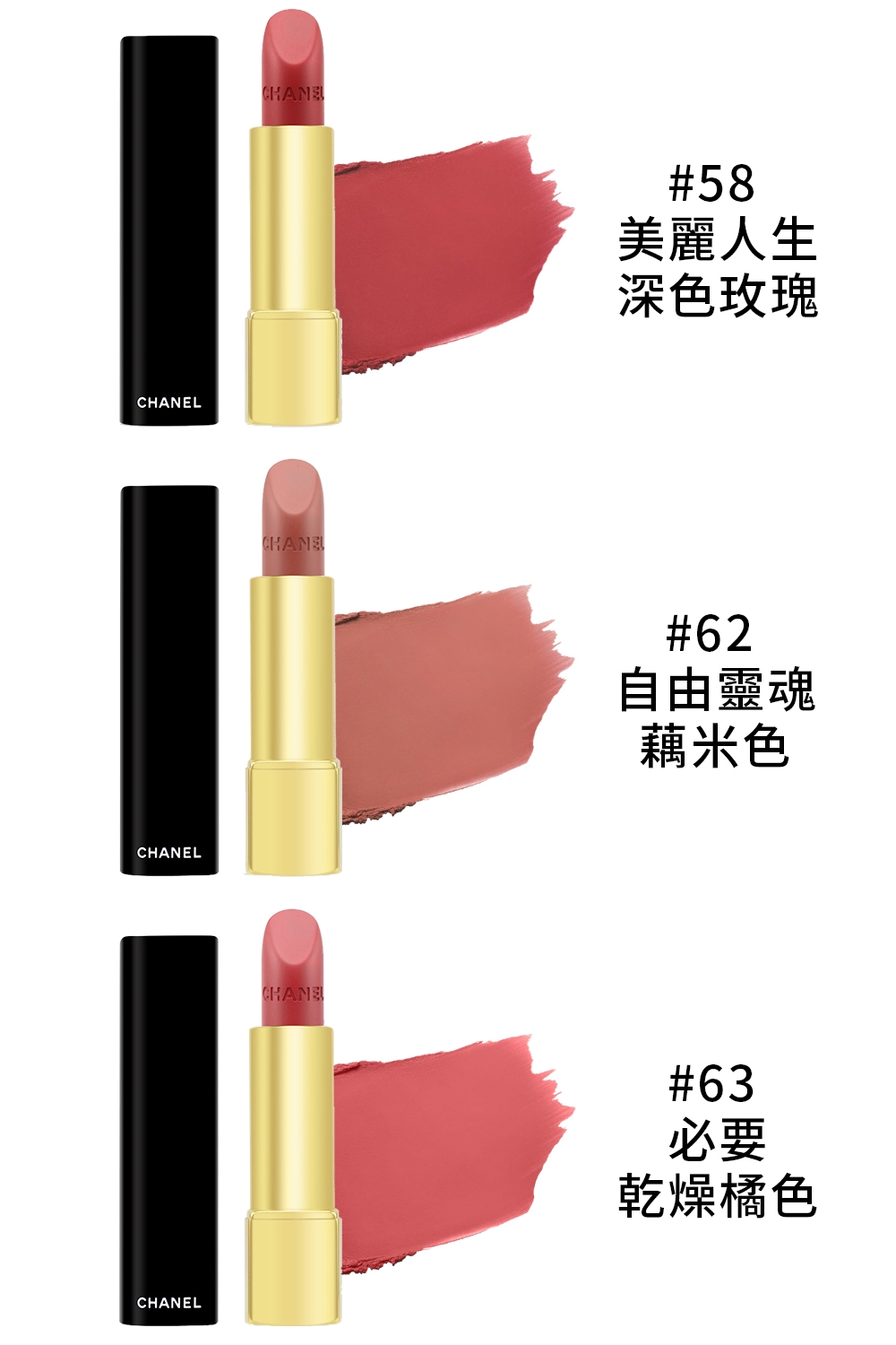 | 色號 | #58美麗人生:深色玫瑰, #62自由靈魂:藕米色, #63必要:乾燥橘色 |