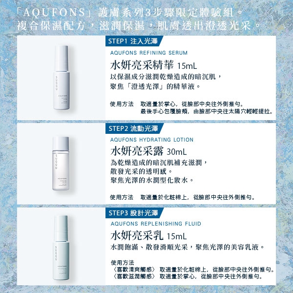 | 規格/容量 | 精華15mL+亮采露30mL+亮采乳15mL+按摩霜30gx2 |