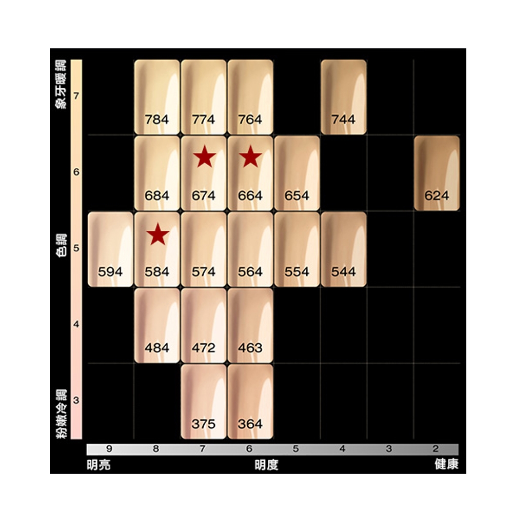| 色號 | #574粉調自然色, #584粉調白皙色, #664象牙健康色, #674象牙自然色, #684象牙白皙色, #774 |
