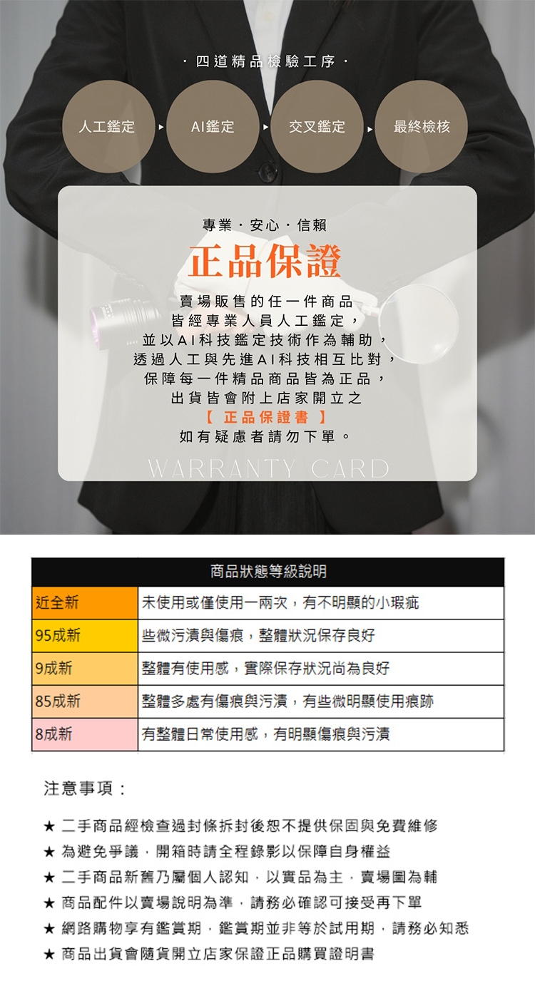 | 注意事項 | (請務必同意確認可接受下列規範後再下單)1.出貨皆會附上我司開立之保證正品購買證明2.賣場標示的配件即為出貨附上之配件3.商品皆經檢測為真品並綁上封條,封條經拆封後恕不接受退貨4.商品新舊程度為主觀判定,請務必確認可接受再下單 |