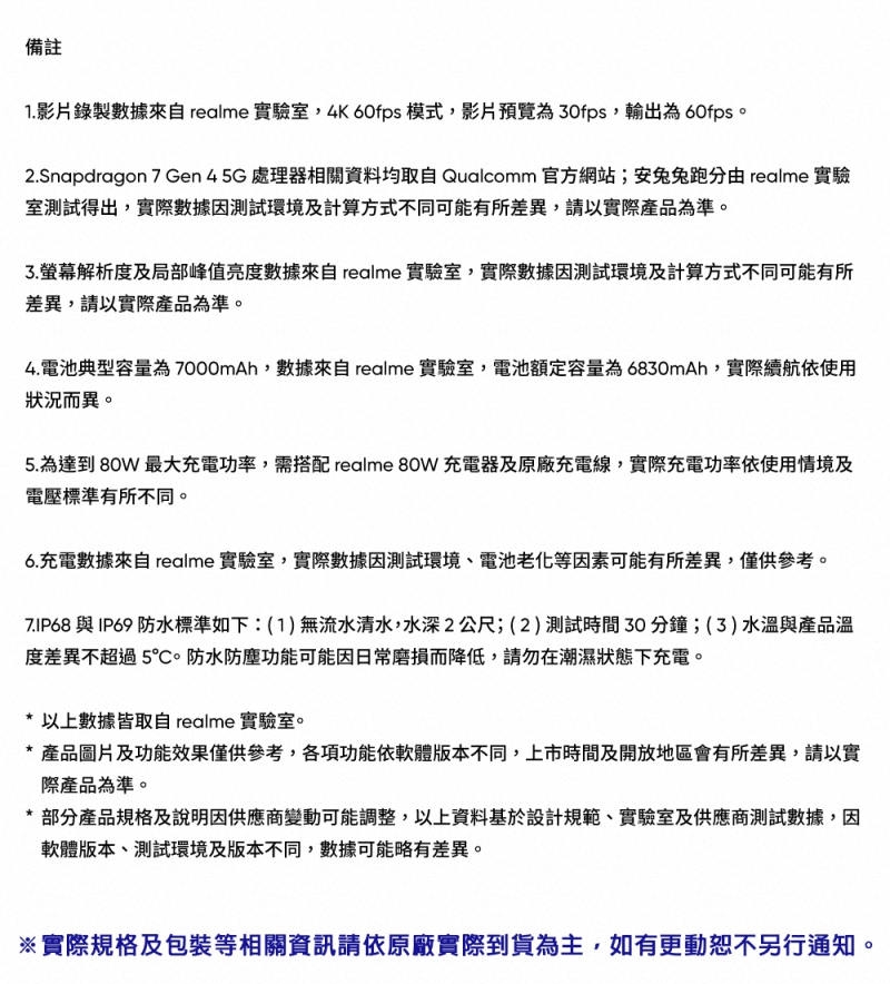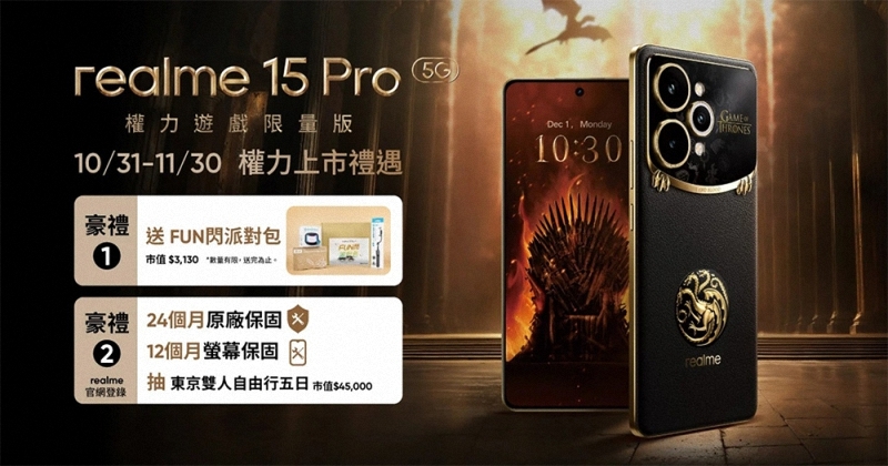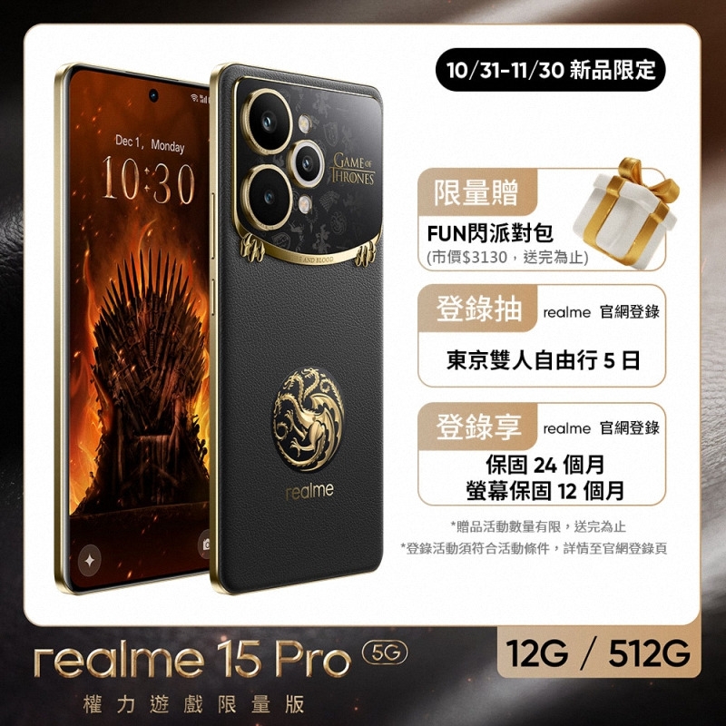 | 盒內容物 | realme 15 Pro權力遊戲限量版手機、USB Type-C 傳輸線、80W 充電器、手機殼、螢幕保護貼(出廠已貼於螢幕)、SIM 卡針、快速指南、重要資訊指南(保固卡) |