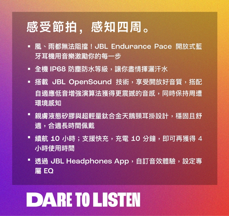 | 包裝內容物 | JBL Endurance Pace 耳機 *1 / 快速入門指南*1 |