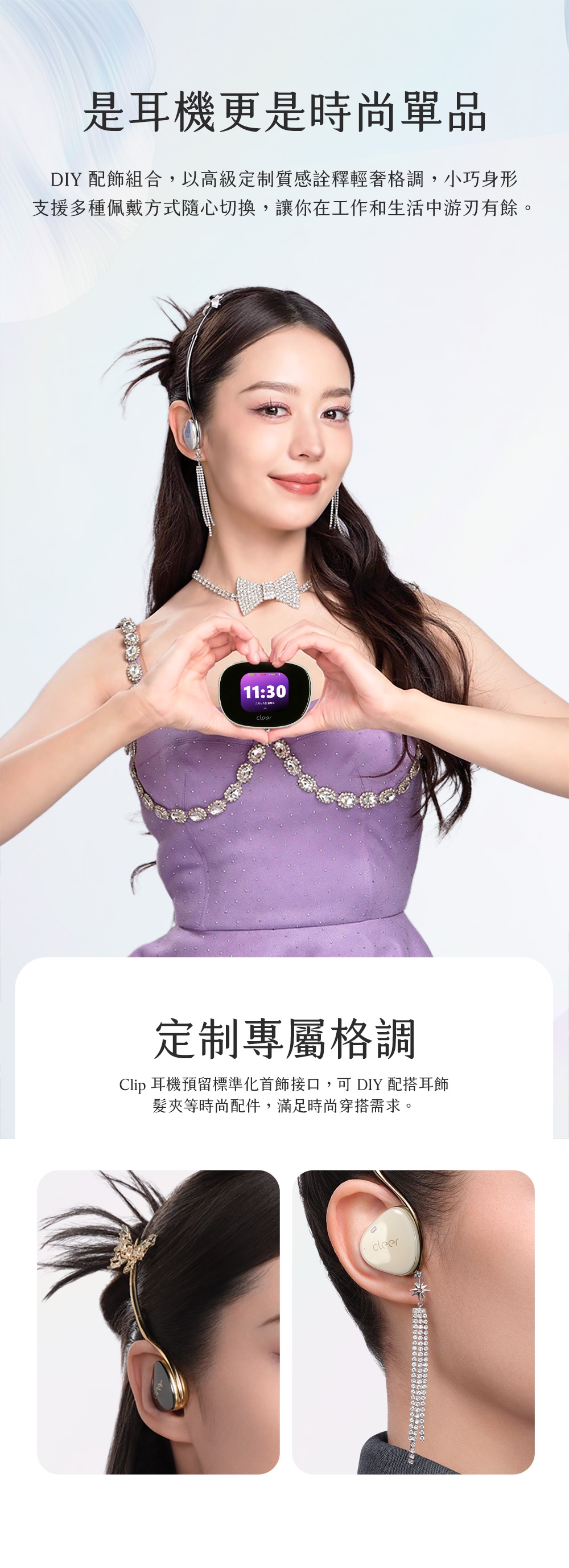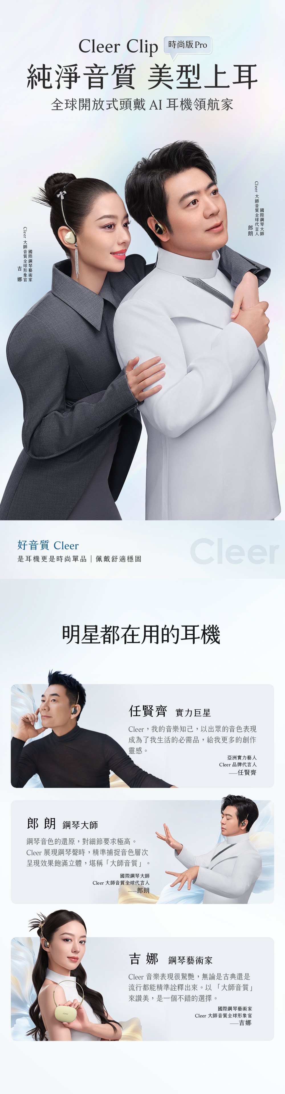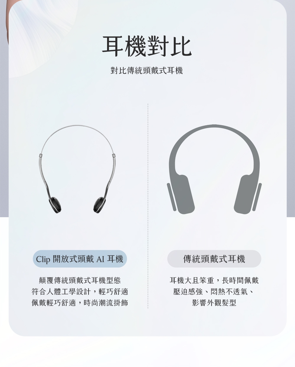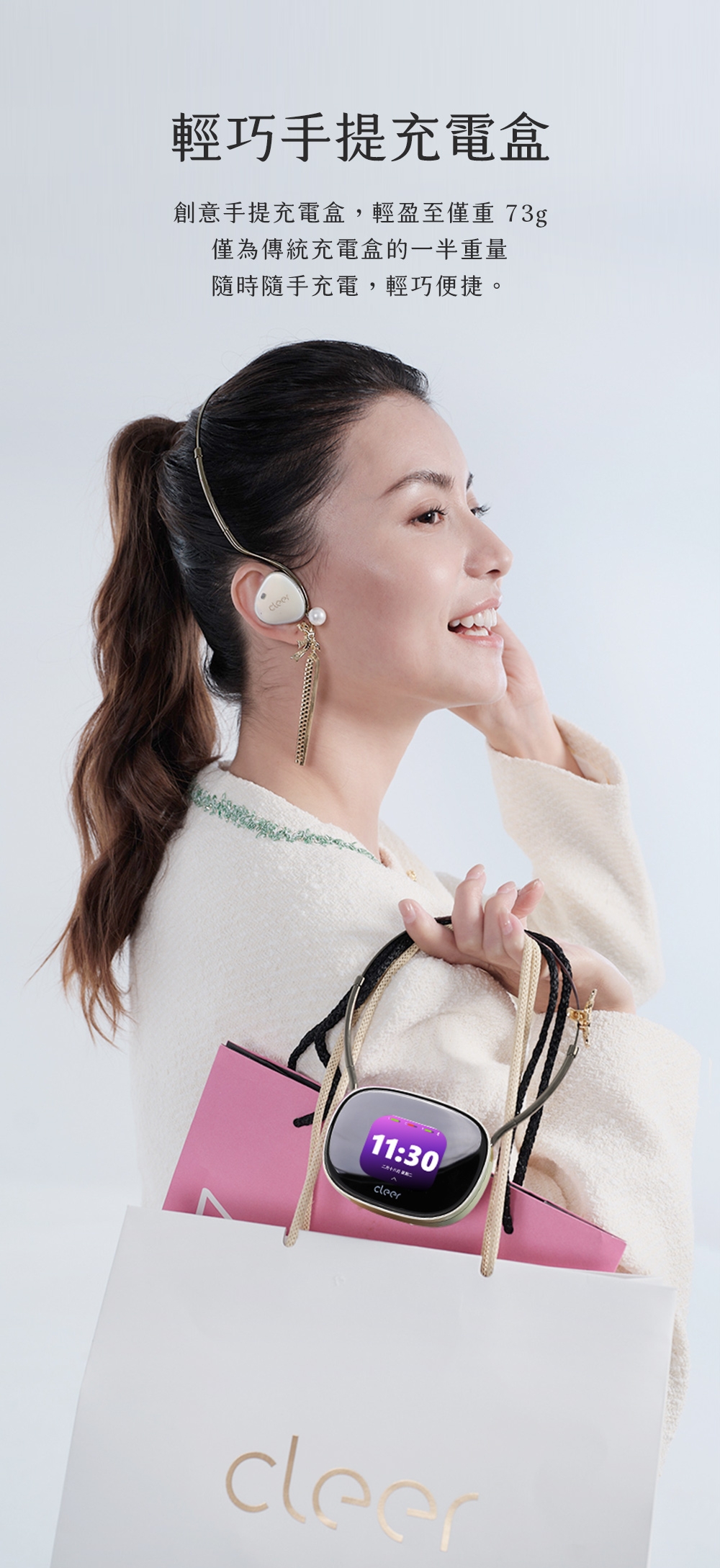 | ▌商品內容物 | Cleer Clip 開放式頭戴AI真無線藍牙耳機(時尚版Pro)充電盒USB Type-C 充電線3對C型夾說明書 |