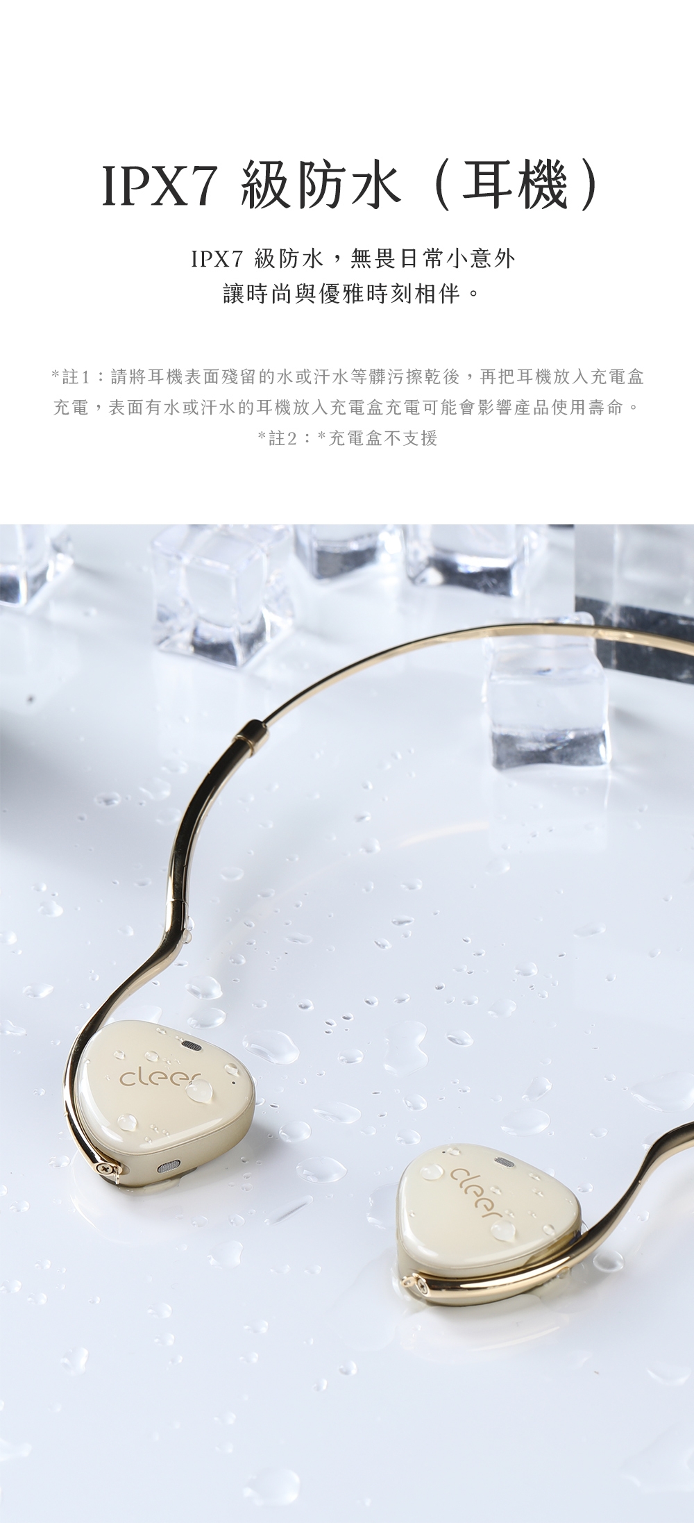 | ▌商品規格 | 產品名稱:Cleer Clip 開放式頭戴AI真無線藍牙耳機(時尚版Pro)外觀設計:可伸縮旋轉調整頭戴設計主要晶片:QCC3091驅動單體:16.2mm動圈揚聲器音源編碼:aptX Lossless、aptX Adaptive、AAC、SBC響應範圍:20 - 20,000Hz藍牙版本:5.4防水等級:IPX7麥克風:兩麥克風雙耳通話:支援通話降噪:AI雙向高清通話降噪播放時間:8小時 (耳機) / 額外20小時 (充電盒) / 總續航共28小時充電時間:充電5分鐘可用1小時充電方式:Type-C耳機重量:36.9g (耳機) / 109.9g (耳機+充電盒) 操控模式:觸控NCC認證:CCAK25LP2230T0(耳機)、CCAK25LP2240T3(充電盒) 品質認證 盜用必究BSMI認證:R3E376 |