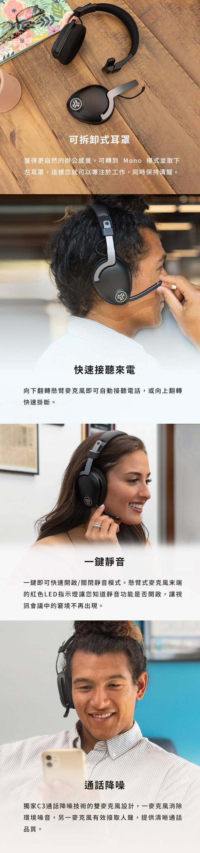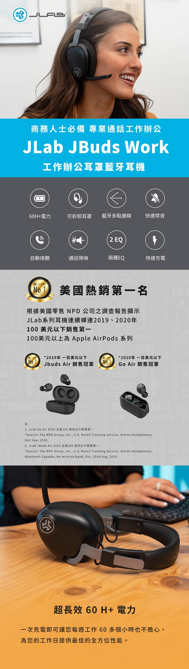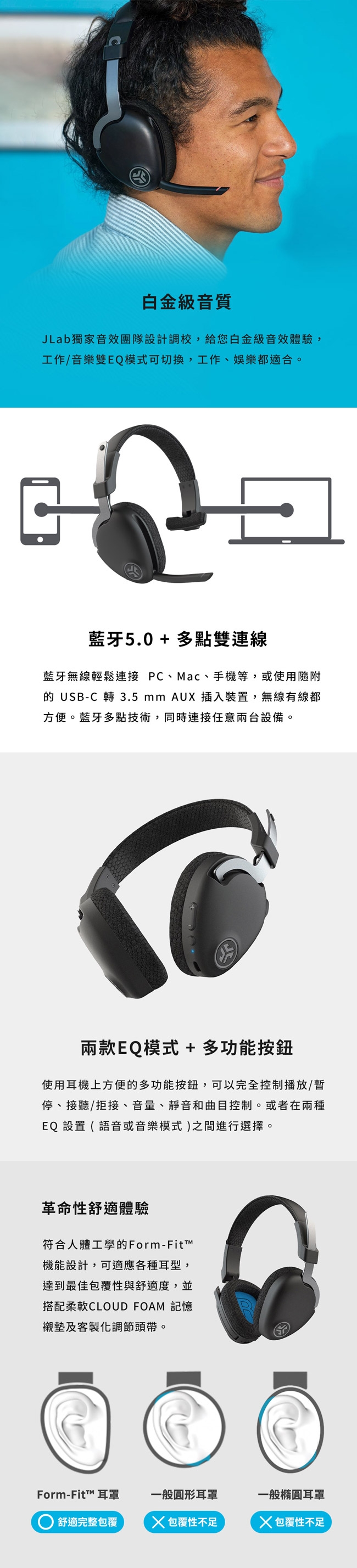 | ▌商品內容物 | JLab JBuds Work 工作辦公耳罩藍牙耳機Type-C 充電線Type-C 轉 3.5mm AUX in |