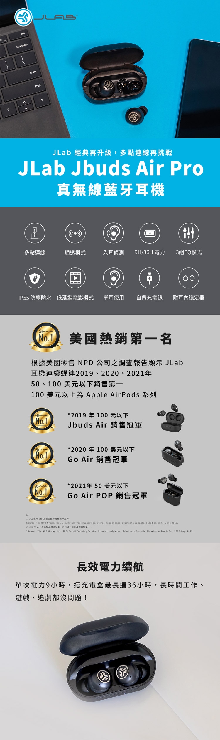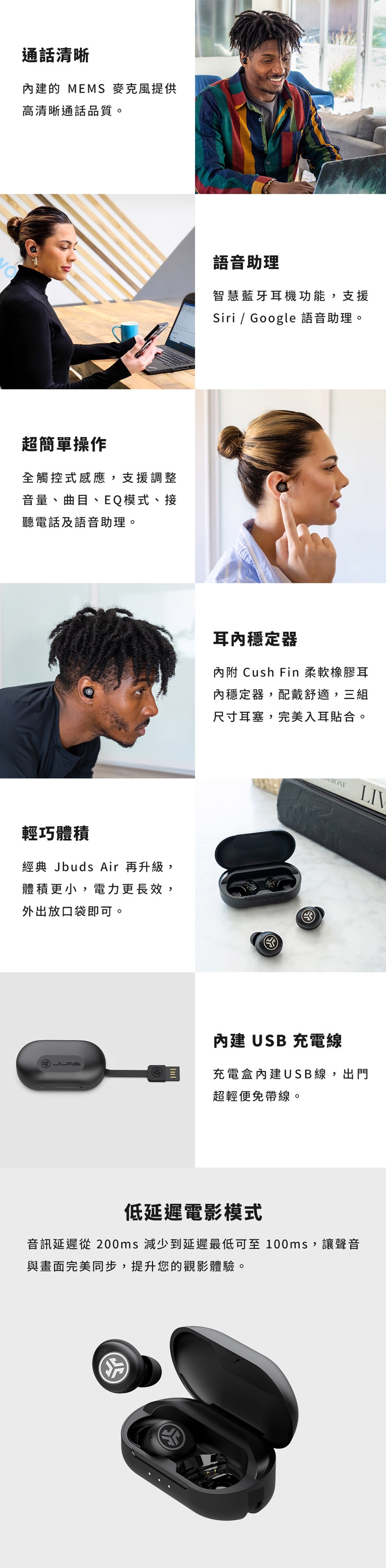 | ▌商品規格 | 產品型號:JLab JBuds Air Pro 真無線藍牙耳機單體尺寸:6mm 動圈單體藍牙版本:5.1防水係數:IP55 防水防塵音頻解碼:SBC響應範圍:20Hz - 20KHz耳機重量:5.3g (單耳) / 49.7g (耳機+充電盒)耳機電量:單耳9小時 / 充電盒27小時 (總共36小時)充電時間:2小時充電接頭:Type-A支援協議:HSP / HFP / A2DP / AVRCP麥克風:MEMS -38dB+/-3dBNCC 認證:CCAH22LP4090T5、CCAH22LP4100T8 品質保證,盜用必究 |