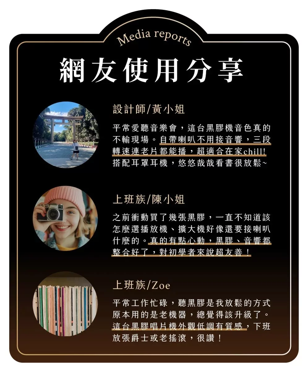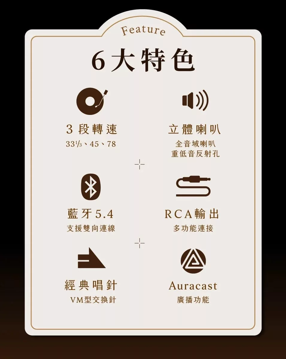 | 配件 | 主機本體<br/>防滑唱片墊<br/>45 RPM 適配器<br/>電源變壓器<br/>快速入門指南<br/>安全資訊與保固手冊<br/>遙控器(含電池)<br/>FM 天線 |