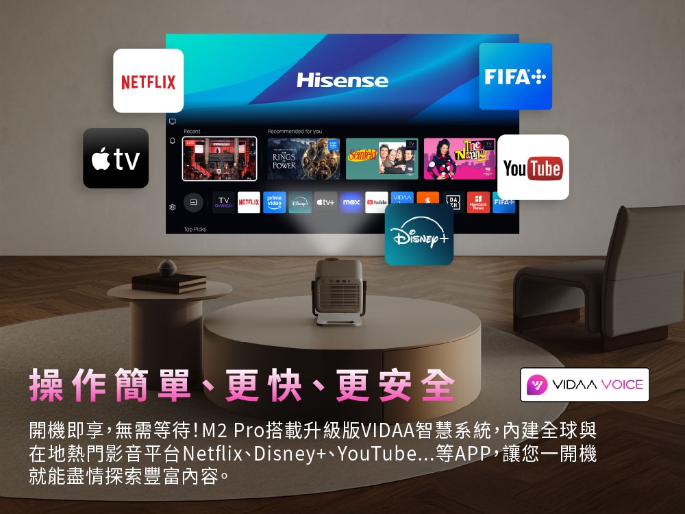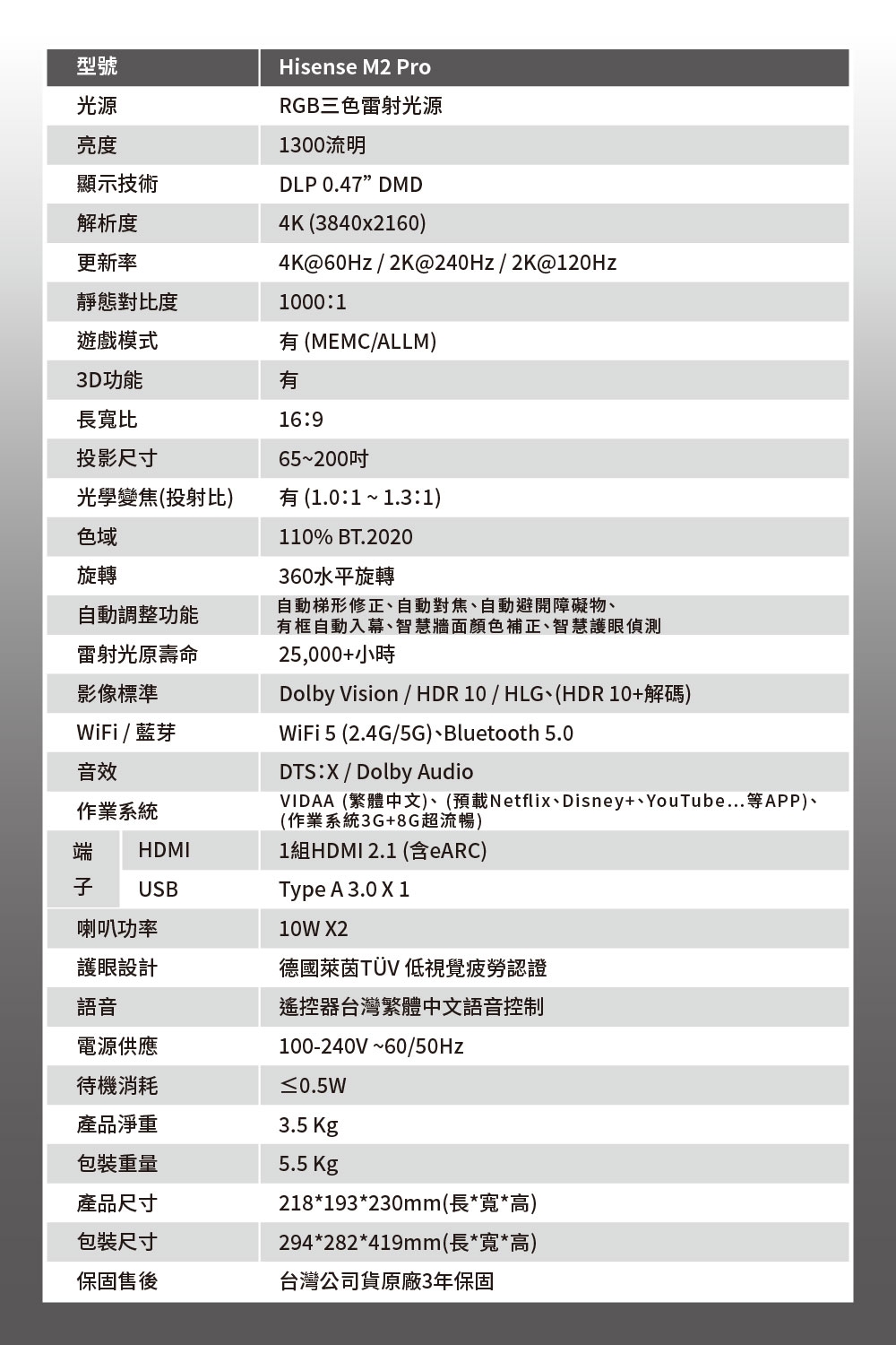 | 特殊功能 | 雲端App無線投影, iPhone投影, 網路連接, 側投, 減少噪音, USB輸入, 無需待機, 內建麥克風, 節能, 色準, 內建App |