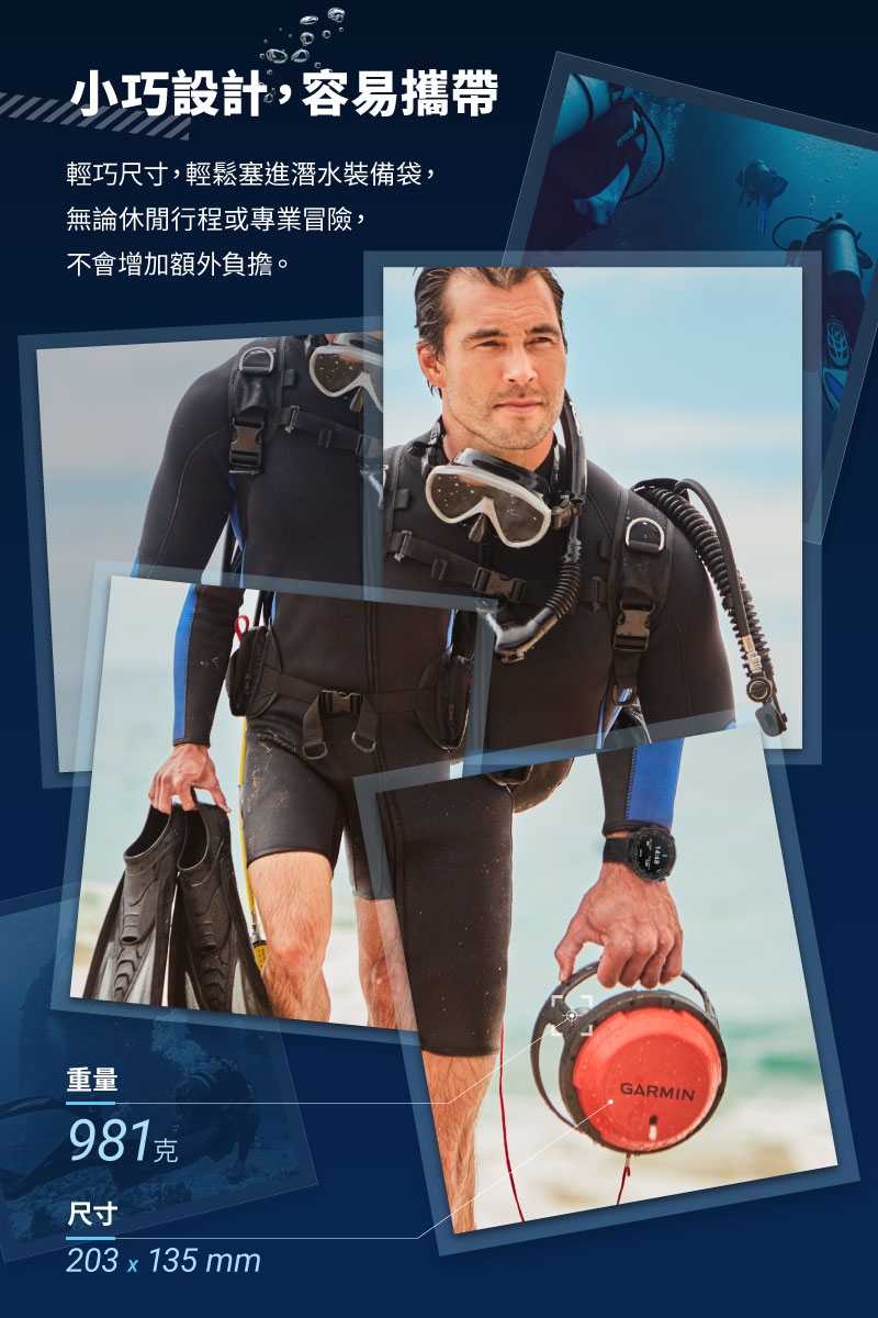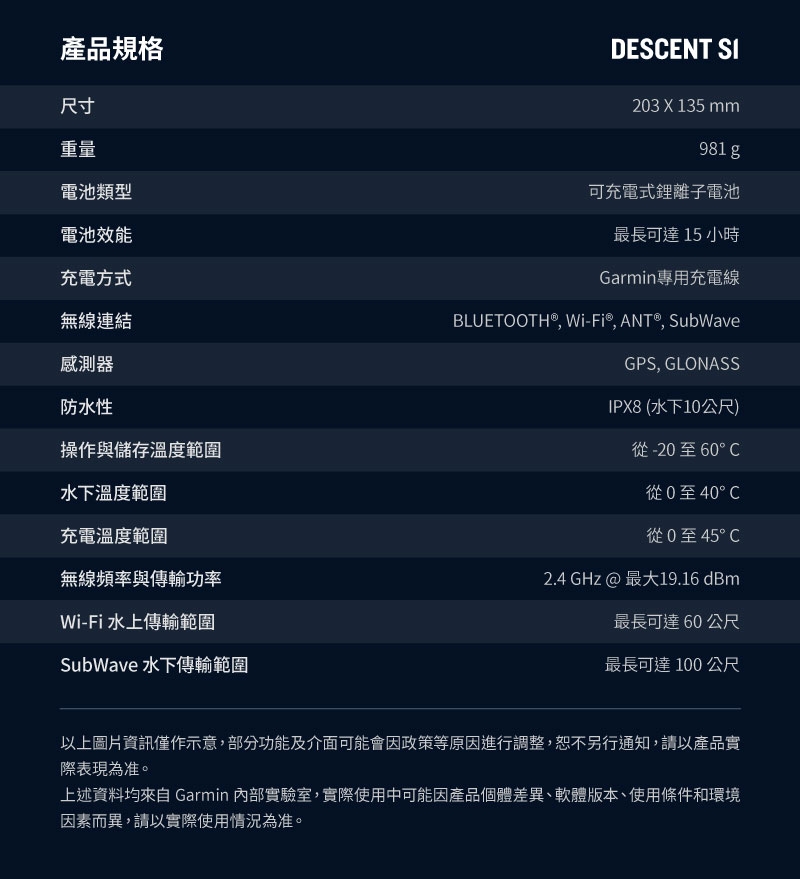 | 內容物 | Descent S1 浮標 攜行袋 充電數據線 繫繩 操作手冊 |