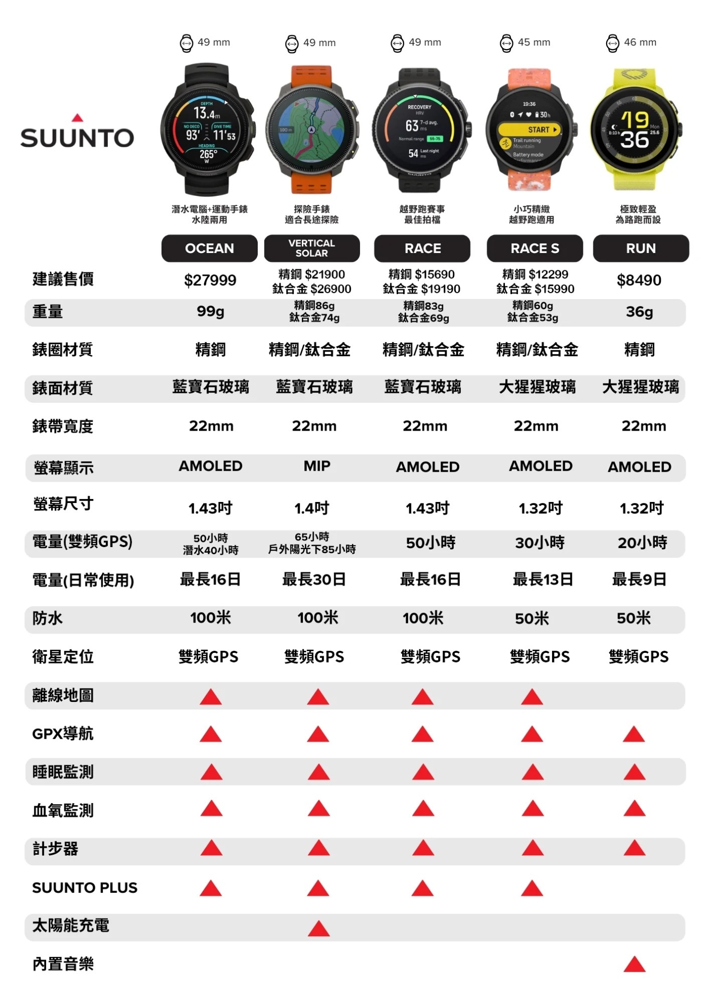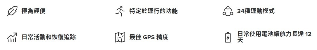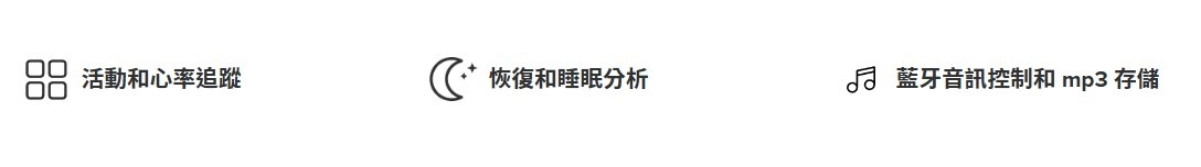 | 功能特性 | 計步, GPS, 心率偵測, 防潑水, 游泳防水, 睡眠監測, 健康數據偵測, 運動偵測, 計時 |