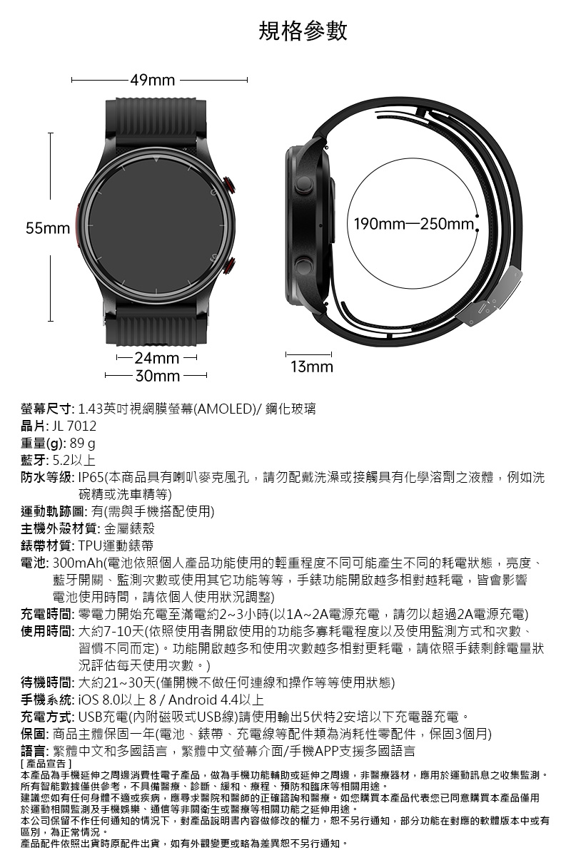 | 電池 | 230mAh(電池依照個人產品功能使用的輕重程度不同可能產生不同的耗電狀態,亮度、藍牙開關、監測次數或使用其它功能等等,手錶功能開啟越多相對越耗電,皆會影響電池使用時間,請依個人使用狀況調整) |