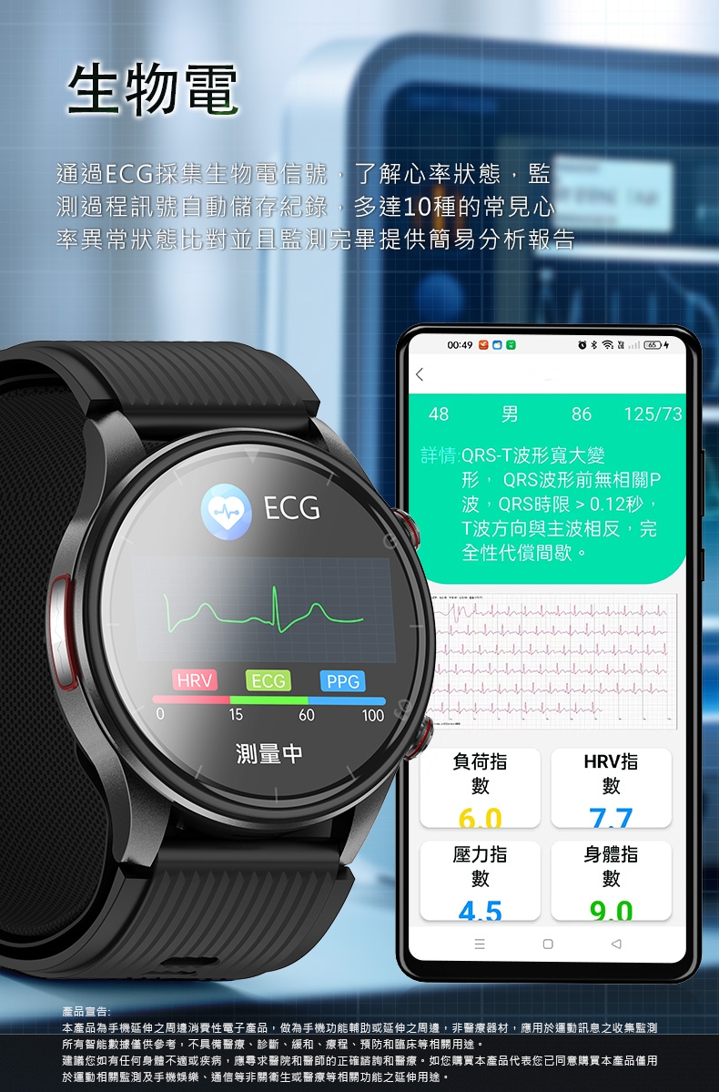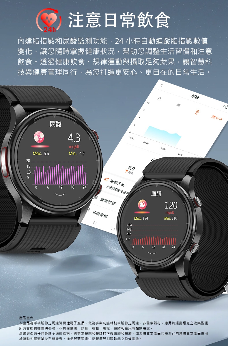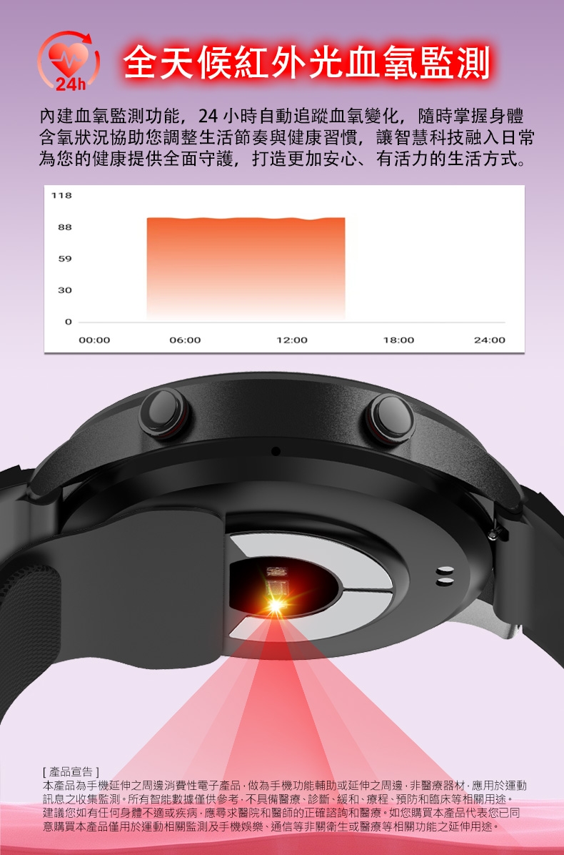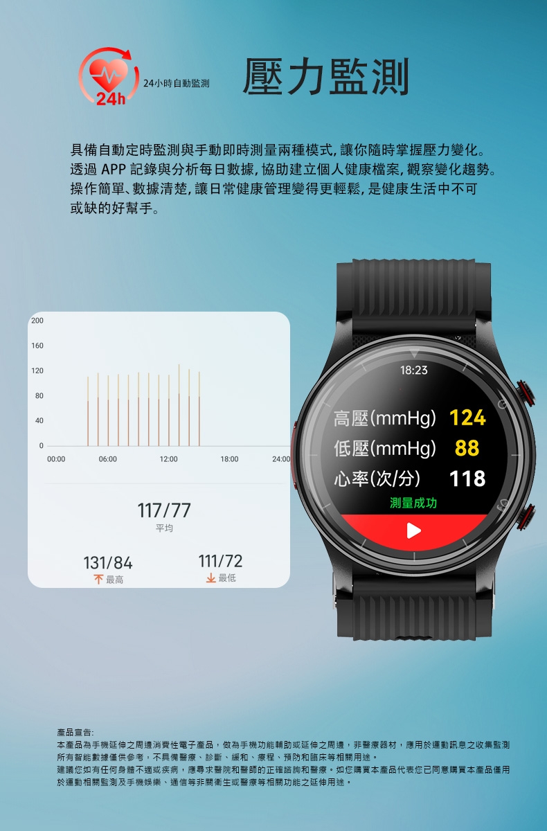 | 產品宣告 | 本產品為手機延伸之周邊消費性電子產品,做為手機功能輔助或延伸之周邊,非醫療器材,應用於運動訊息之收集監測。所有智能數據僅供參考,不具備醫療、診斷、緩和、療程、預防和臨床等相關用途。建議您如有任何身體不適或疾病,應尋求醫院和醫師的正確諮詢和醫療。如您購買本產品代表您已同意購買本產品僅用於運動相關監測及手機娛樂、通信等非關衛生或醫療等相關功能之延伸用途。-----------------------------------------------------------------------------------------本公司保留不作任何通知的情況下,對產品說明書內容做修改的權力,恕不另行通知,部分功能在對應的軟體版本中或有區別,為正常情況。產品配件依照出貨時原配件出貨,如有外觀變更或略為差異恕不另行通知。 |