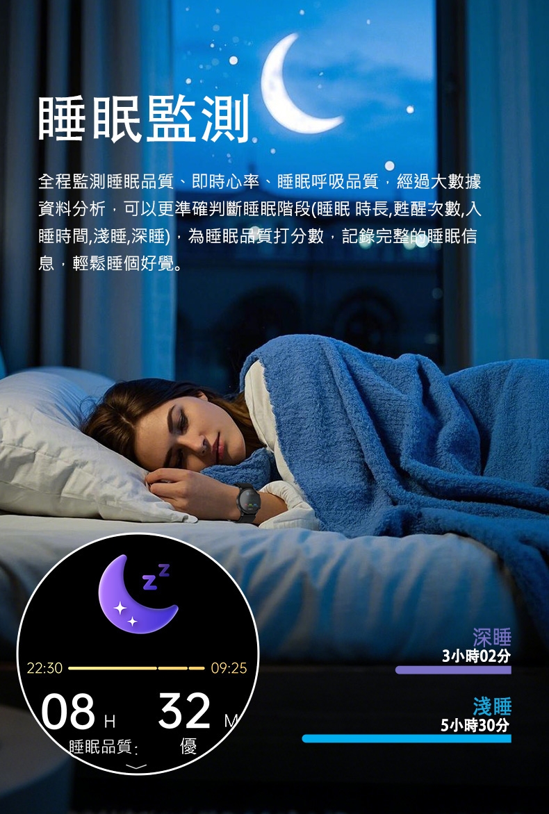 | 功能特性 | 心率偵測, 防潑水, 計步, 久坐提醒, 睡眠監測, 簡訊, 社群訊息, 健康數據偵測, 運動偵測, 計時, 血氧偵測, 鬧鐘, 藍芽通話 |