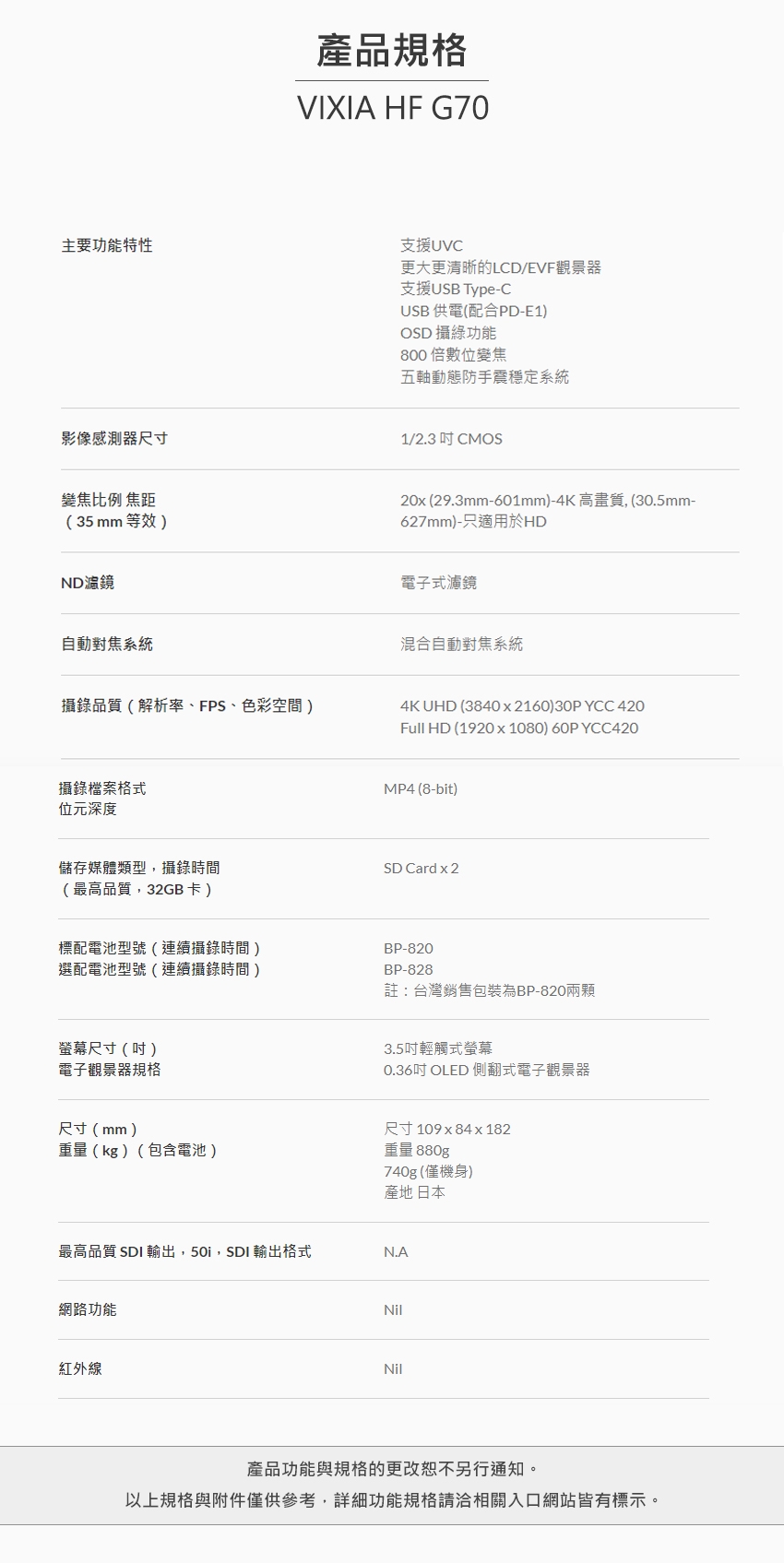 | 備註1 | 所有資料均按Canon之標準測試方式取得,產品規格如有變更,恕不另行通知。 |
