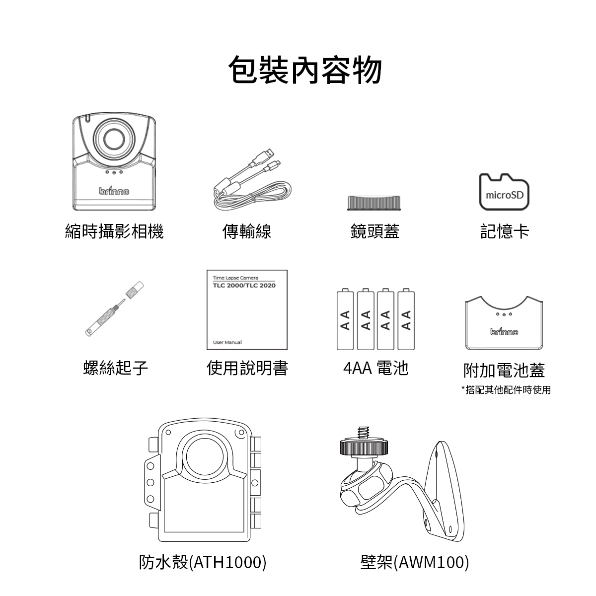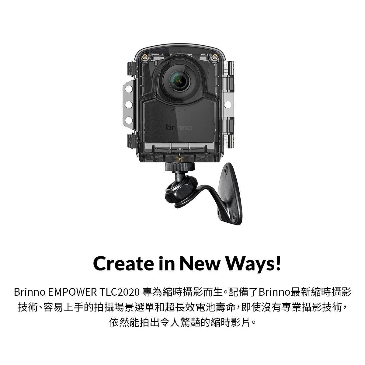 Brinno TLC2020M 縮時攝影機,支援 Full HD 影像品質,內建 TFT LCD 螢幕,無光學變焦,使用 microSD 系列記憶卡儲存,電源為 AA 電池,輕巧便攜,錄影時間可達82天(間隔5分鐘),提供12個月保固及BSMI許可。