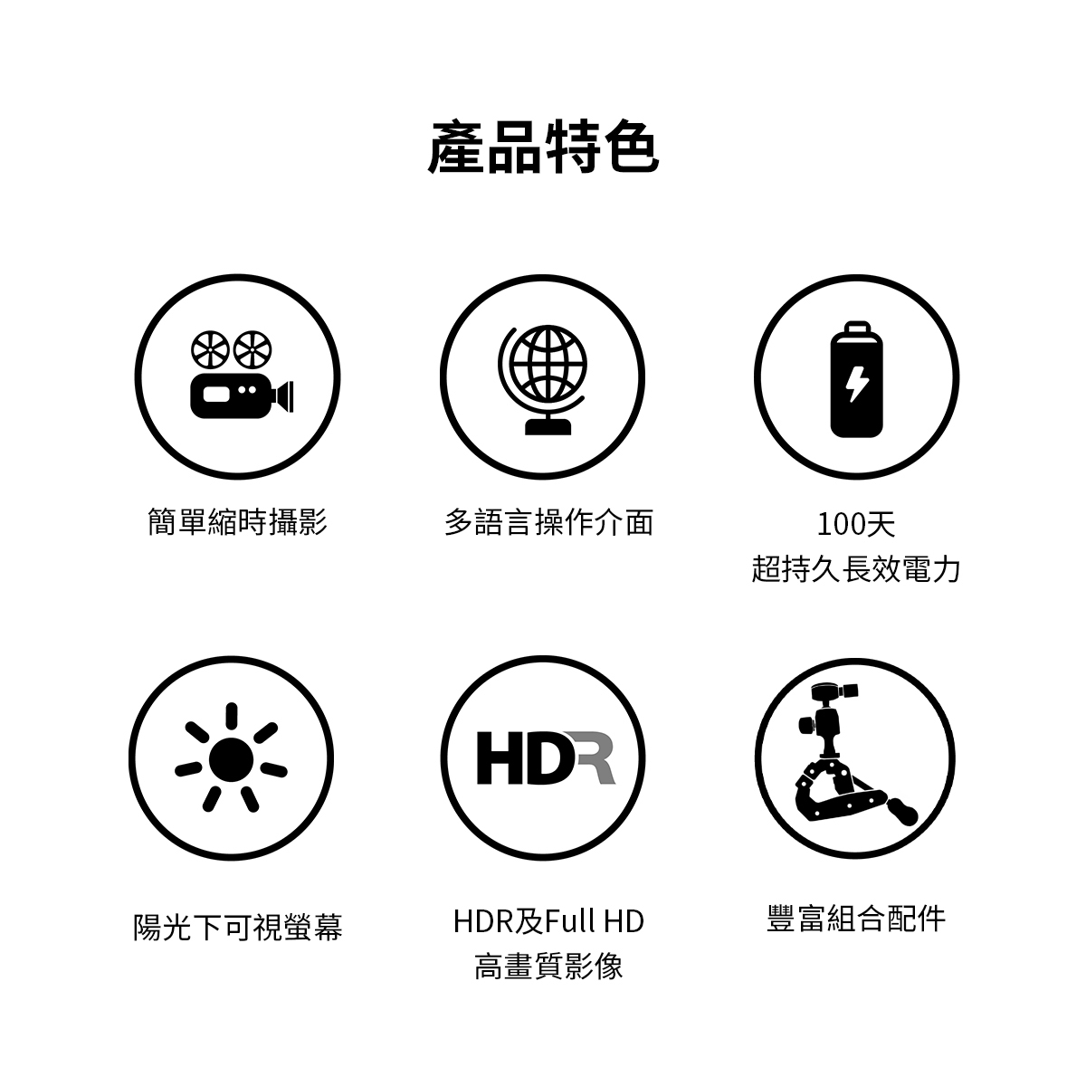 | 錄影時間(使用隨附已充飽電的電池) | 100天 @每5min一張週期 |