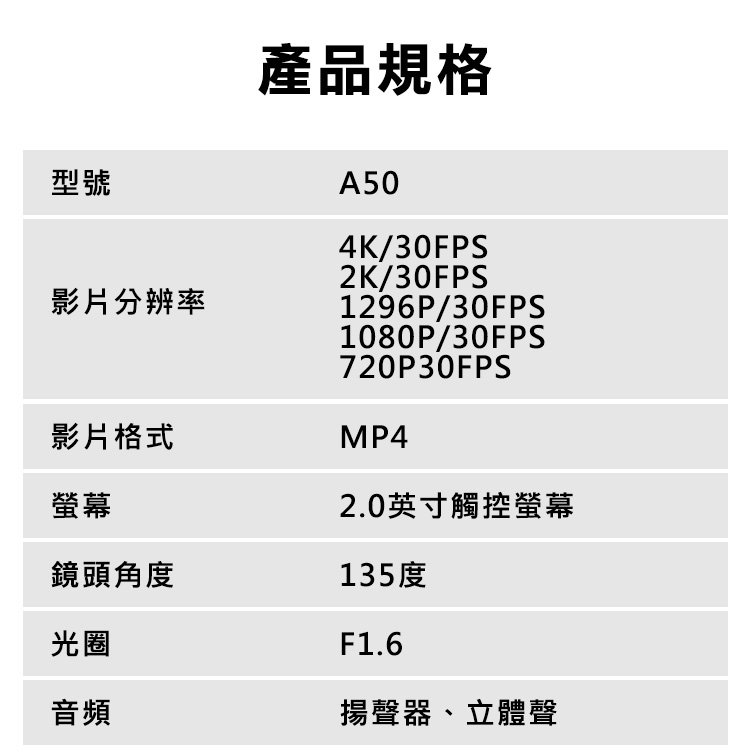 FLYone SJCAM A50 是一款具備4K錄影功能的行動攝影機,無光學變焦設計,支援MP4與JPEG格式。內建GPS與WIFI功能,搭配可觸控螢幕與microSD儲存,輕巧便攜,重量約150g。採用鋰電池供電,提供長時間錄影體驗,並附有NCC認證碼與BSMI許可字號,品質有保障。