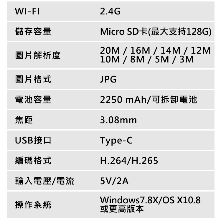 | 攝影機尺寸 (寬 x 高 x 深) (mm) | 約5.4x3.3x8.6 cm |