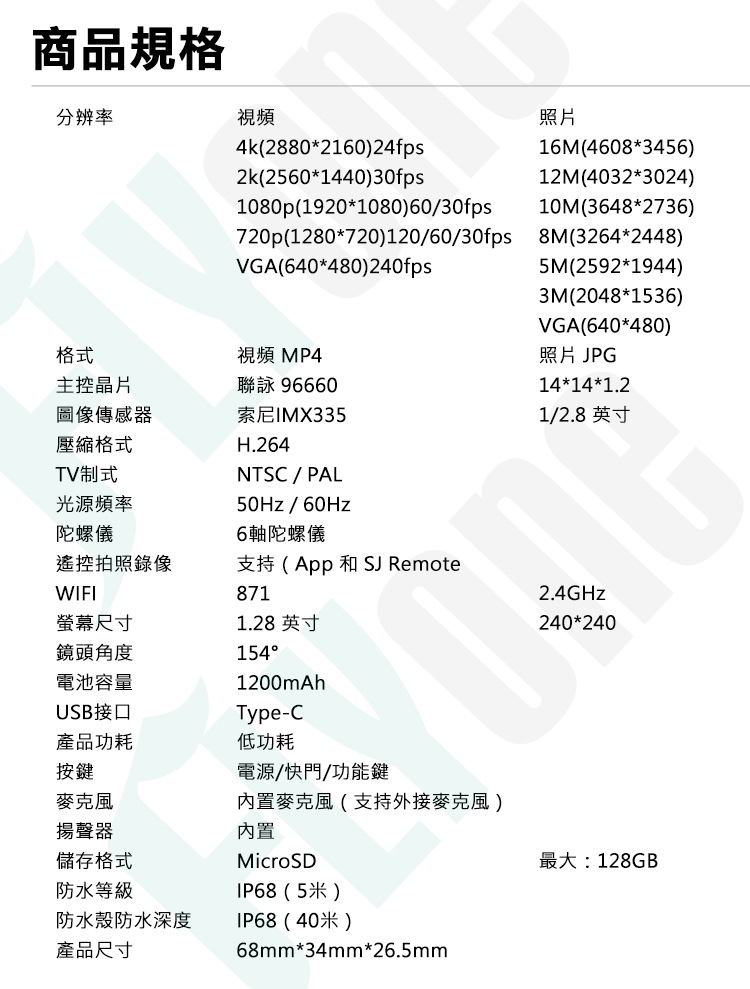 | 攝影機尺寸 (寬 x 高 x 深) (mm) | 約68×34×26.5 mm |