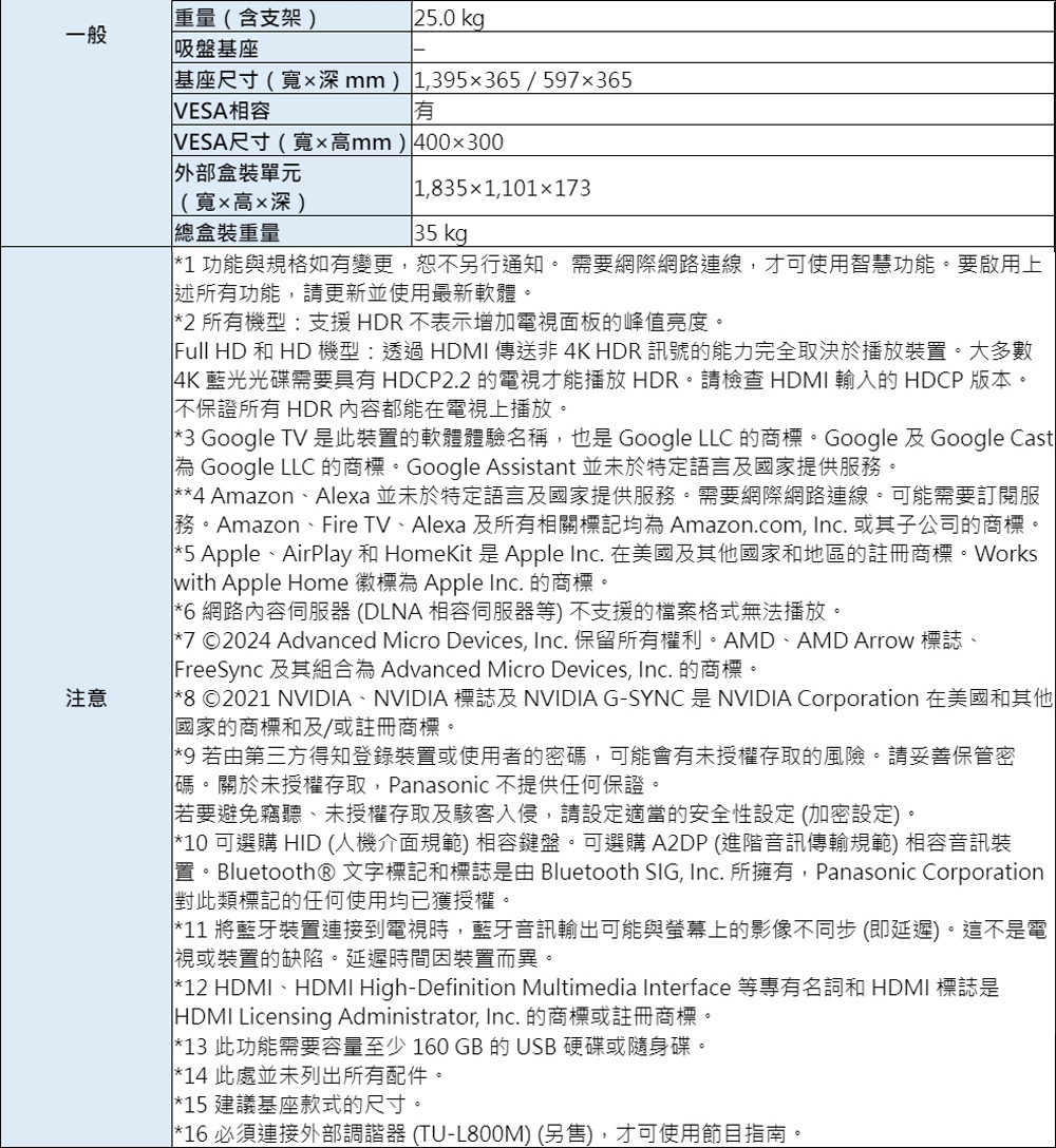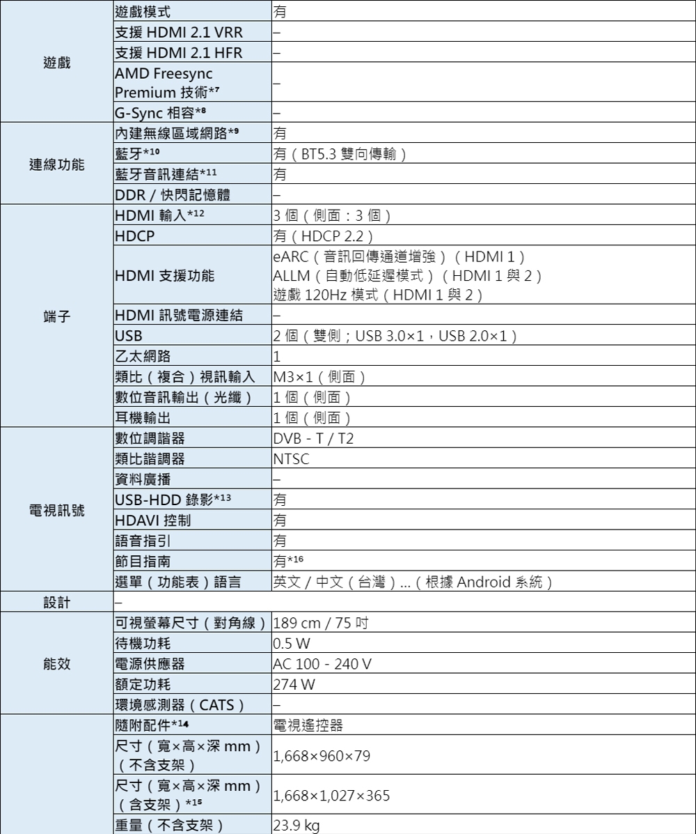 | 尺寸(寬x高x深) | (不含支架)寬1668×高960×深79 mm;(含支架)寬1668×高1027×深365 mm |