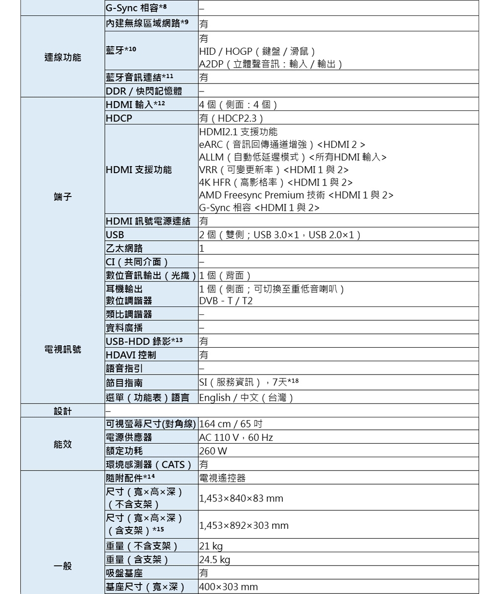 | 尺寸(寬x高x深) | 不含支架 寬1453 x 高840 x 深83;含支架 寬1453 x 高892 x 深303 mm |