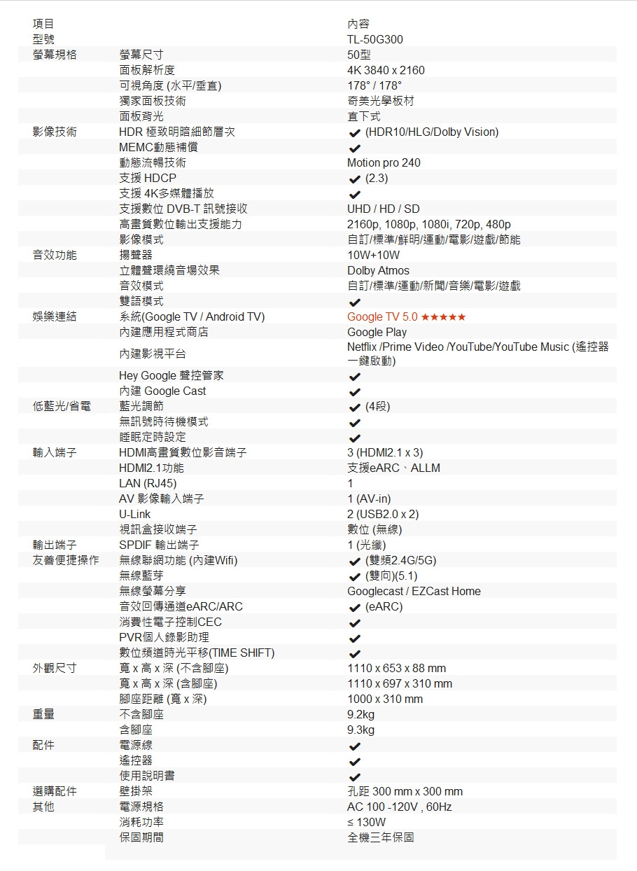 | 面板尺寸(英吋) | 50吋 |