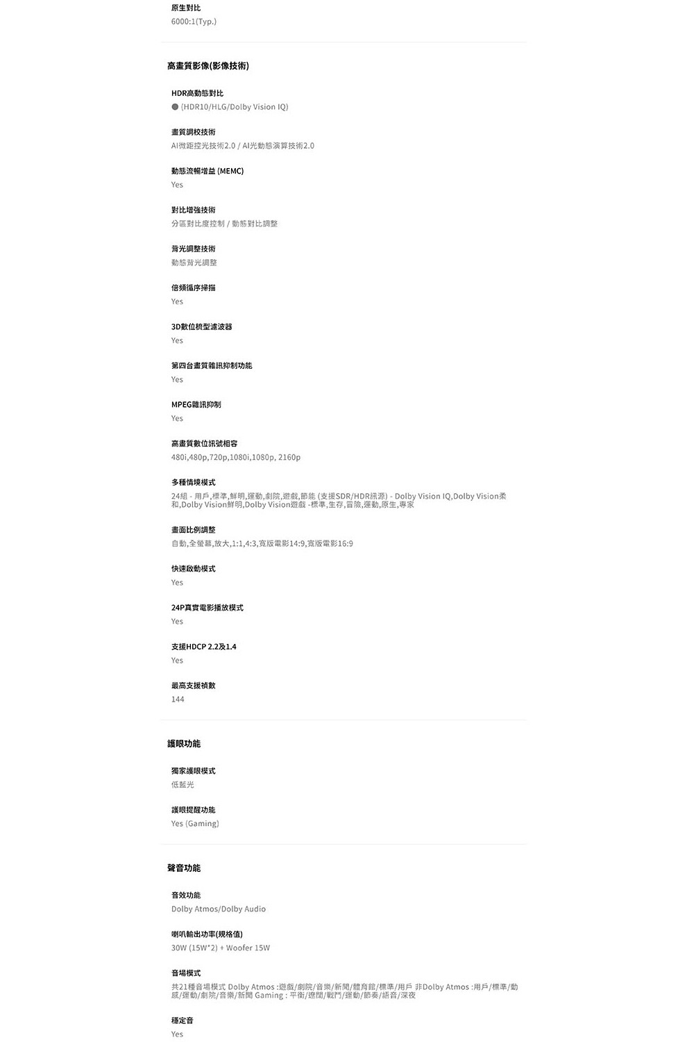 | 環繞音場 | 杜比數位音效, S-FORCE 立體環繞音場 |