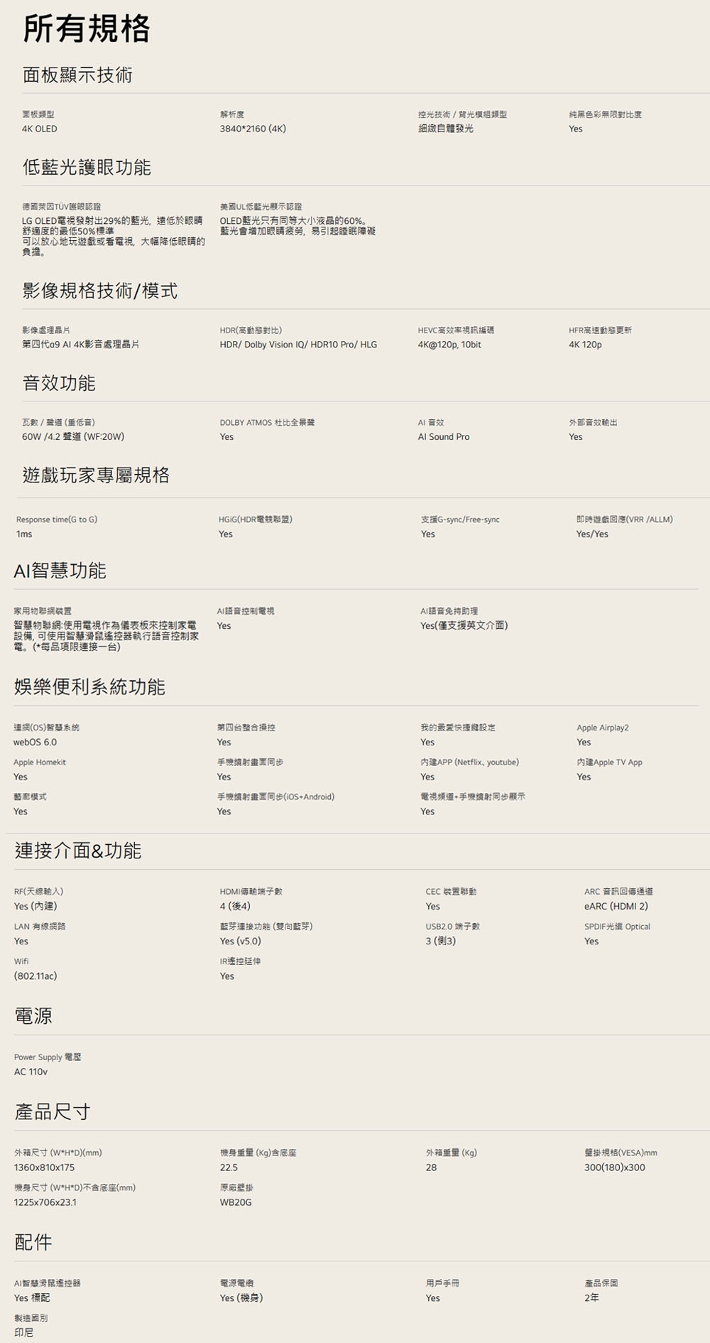 | 尺寸(寬x高x深) | 機身尺寸 (W*H*D)不含底座(mm):1225x706x23.1 |