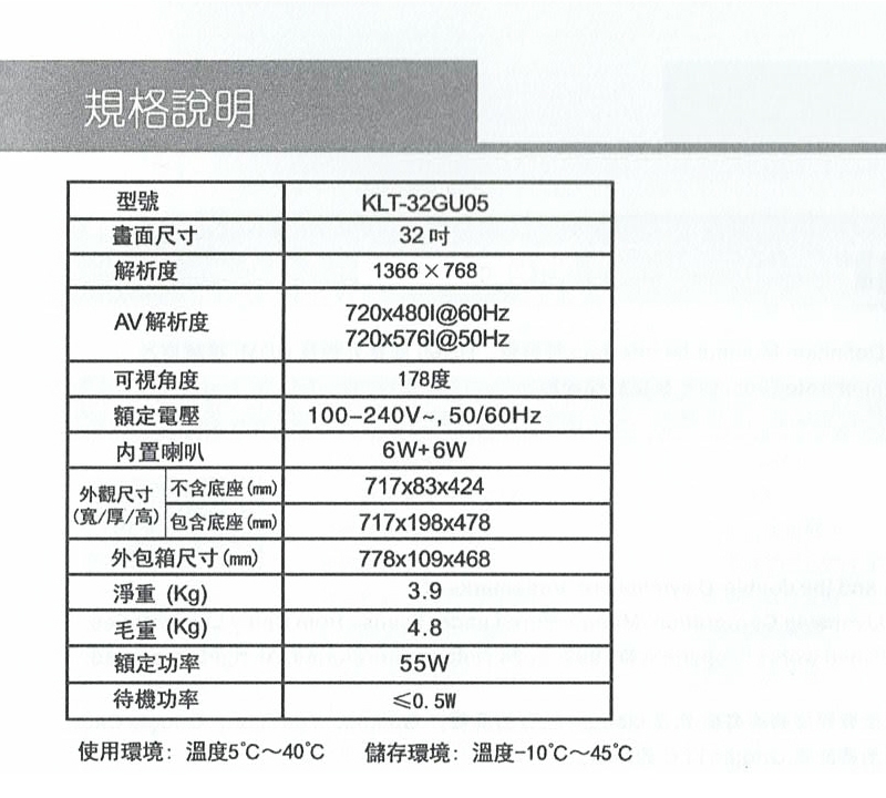 | 型號 | KLT-32GU05 |