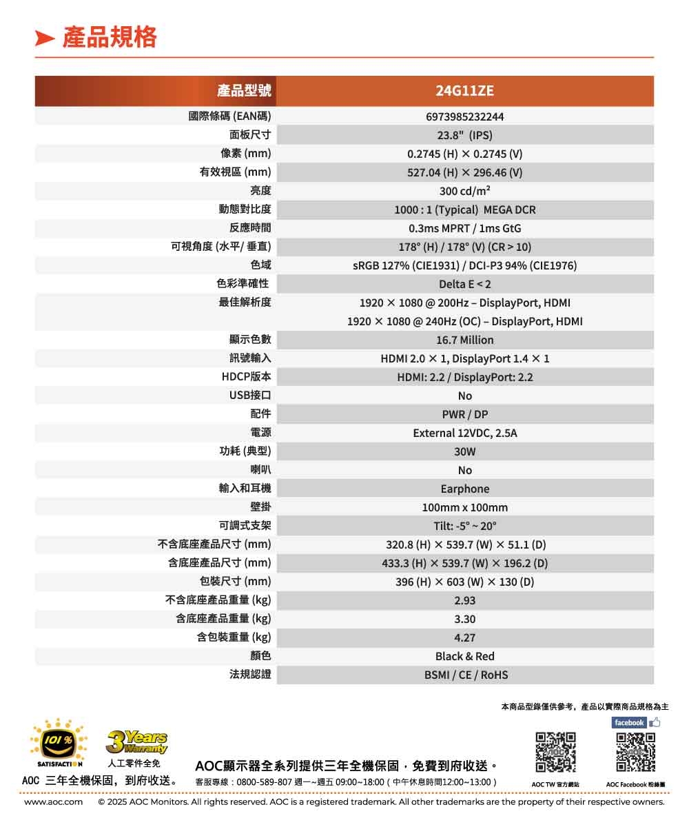 | 特殊功能 | HDR, 電競, 抗藍光, 零閃屏, 窄邊框 |