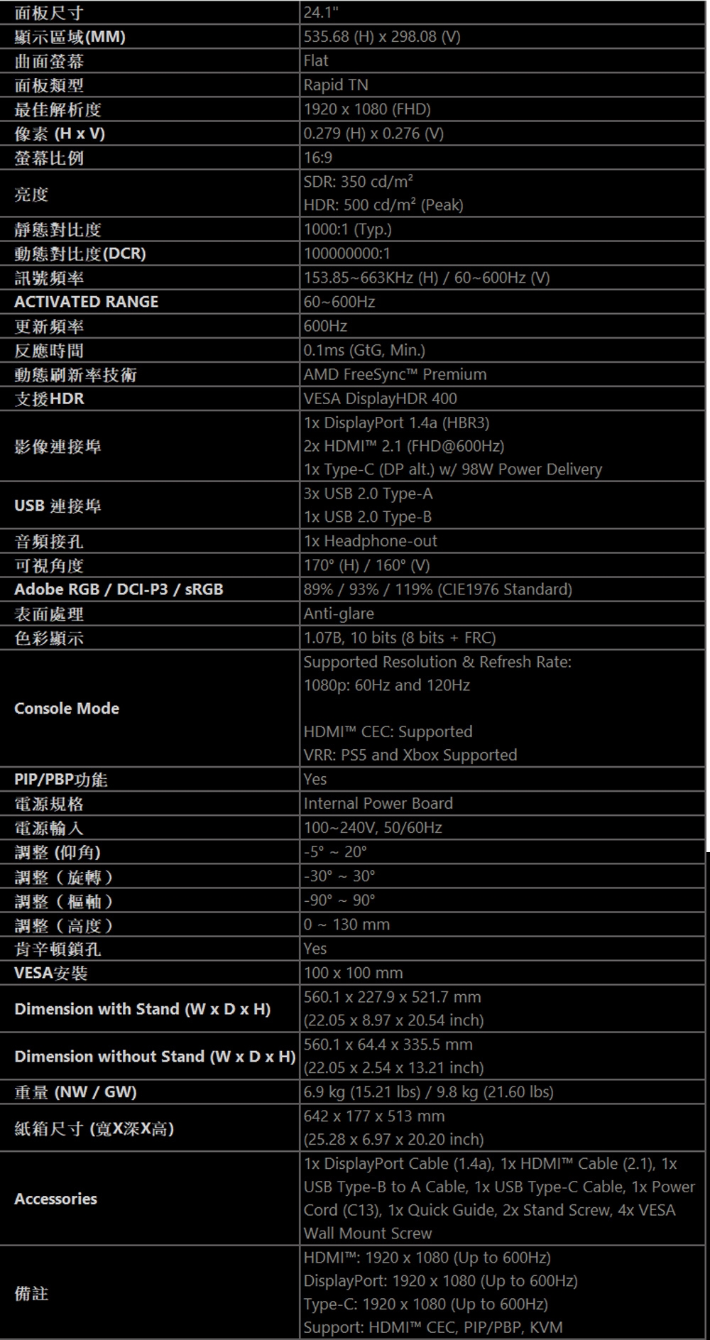 | 特殊功能 | HDR, 抗藍光, 電競, 護眼, 窄邊框 |