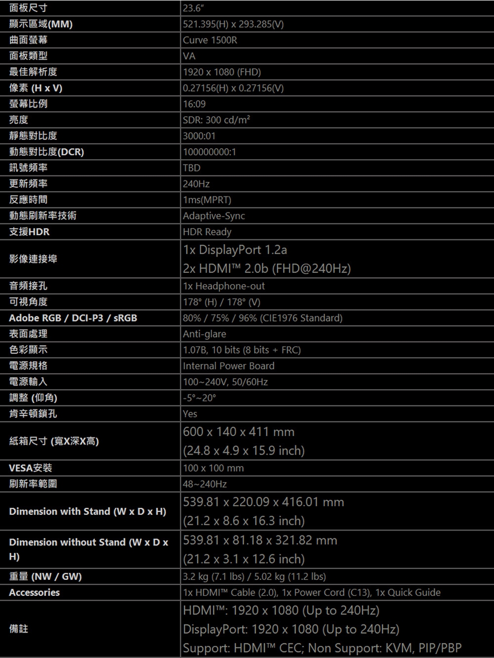 | 特殊功能 | HDR, 抗藍光, 電競, 護眼, 窄邊框 |