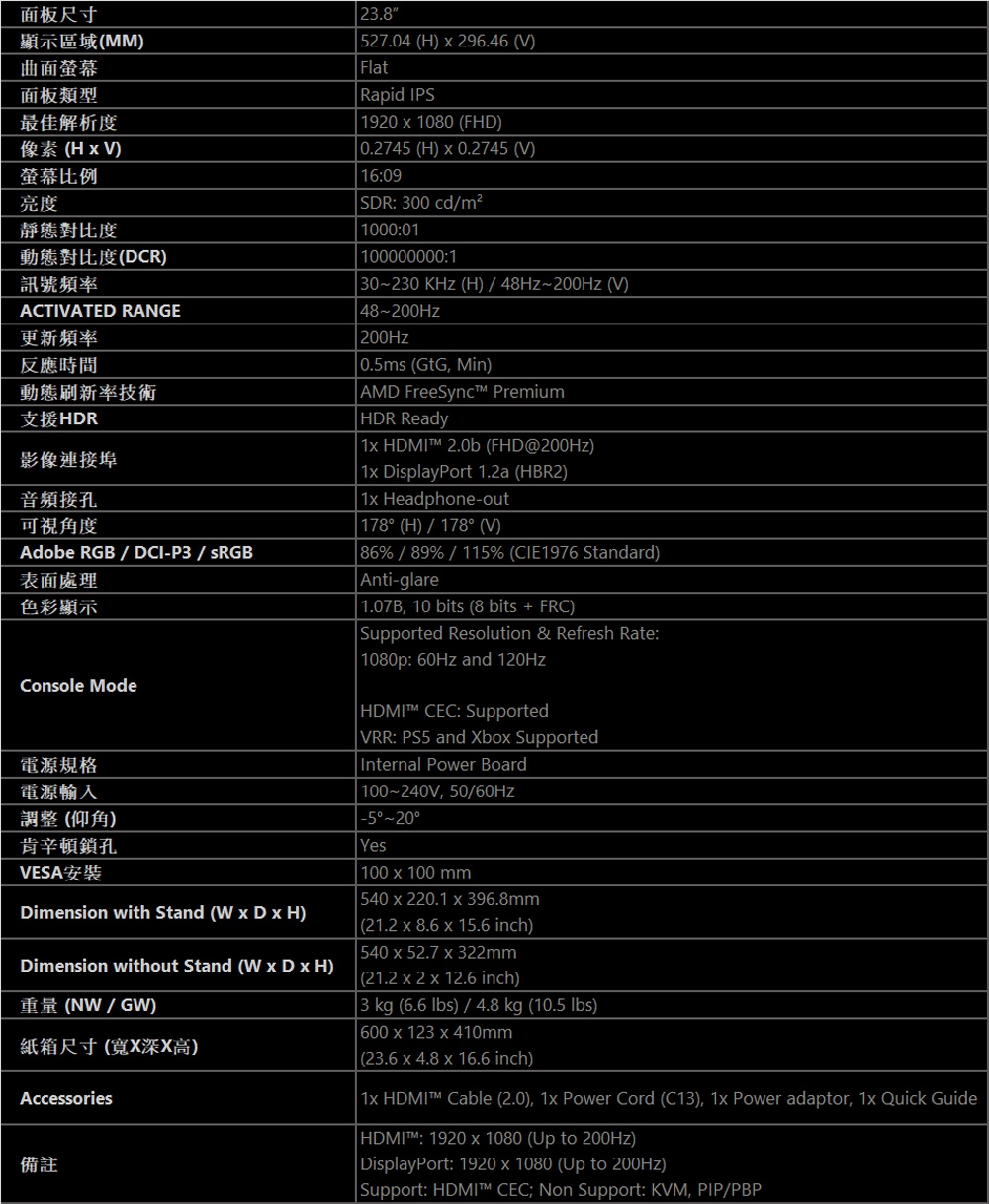 | 特殊功能 | HDR, 抗藍光, 電競, 護眼, 窄邊框 |