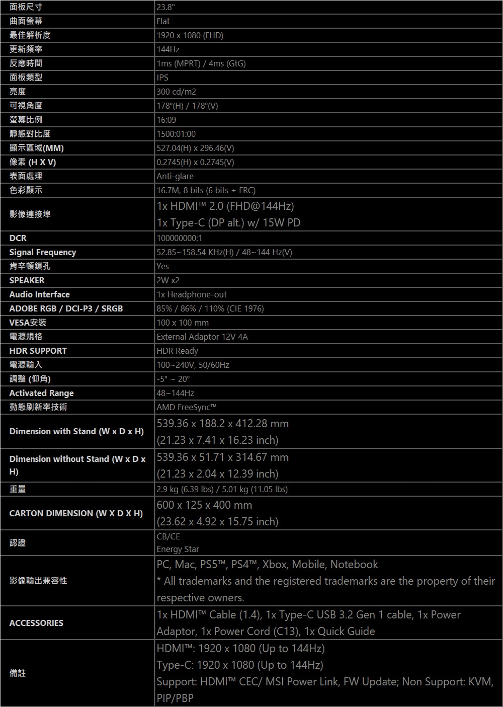 | 更新頻率(Hz) | 144Hz |