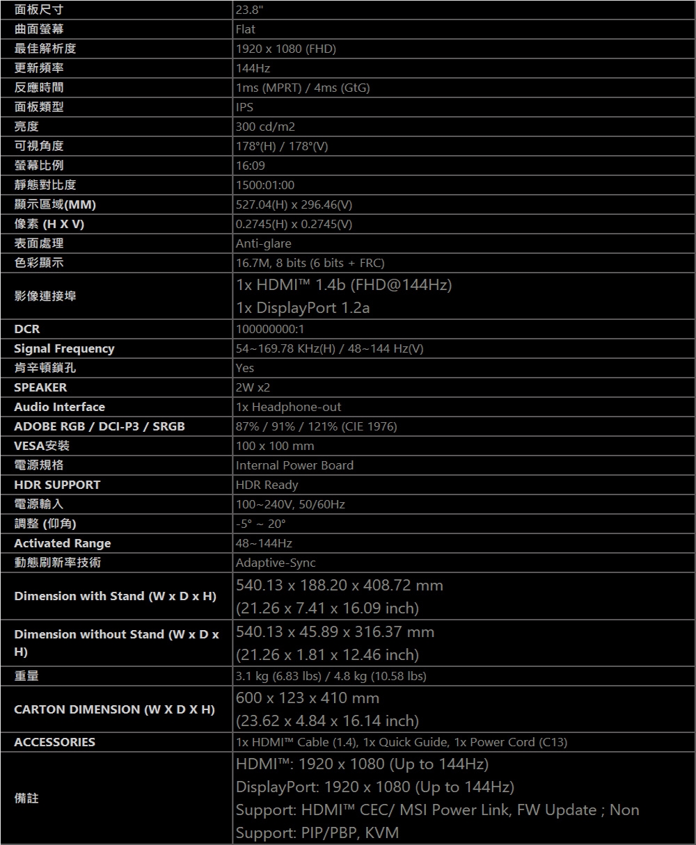 | 更新頻率(Hz) | 144Hz |