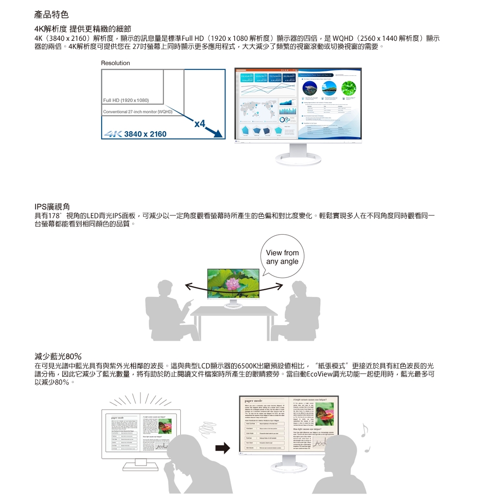 | 特殊功能 | 抗藍光, 護眼, 零閃屏, 窄邊框, 節能, 廣視角, 左右旋轉, 90度樞軸旋轉, 超薄機身, 4K |