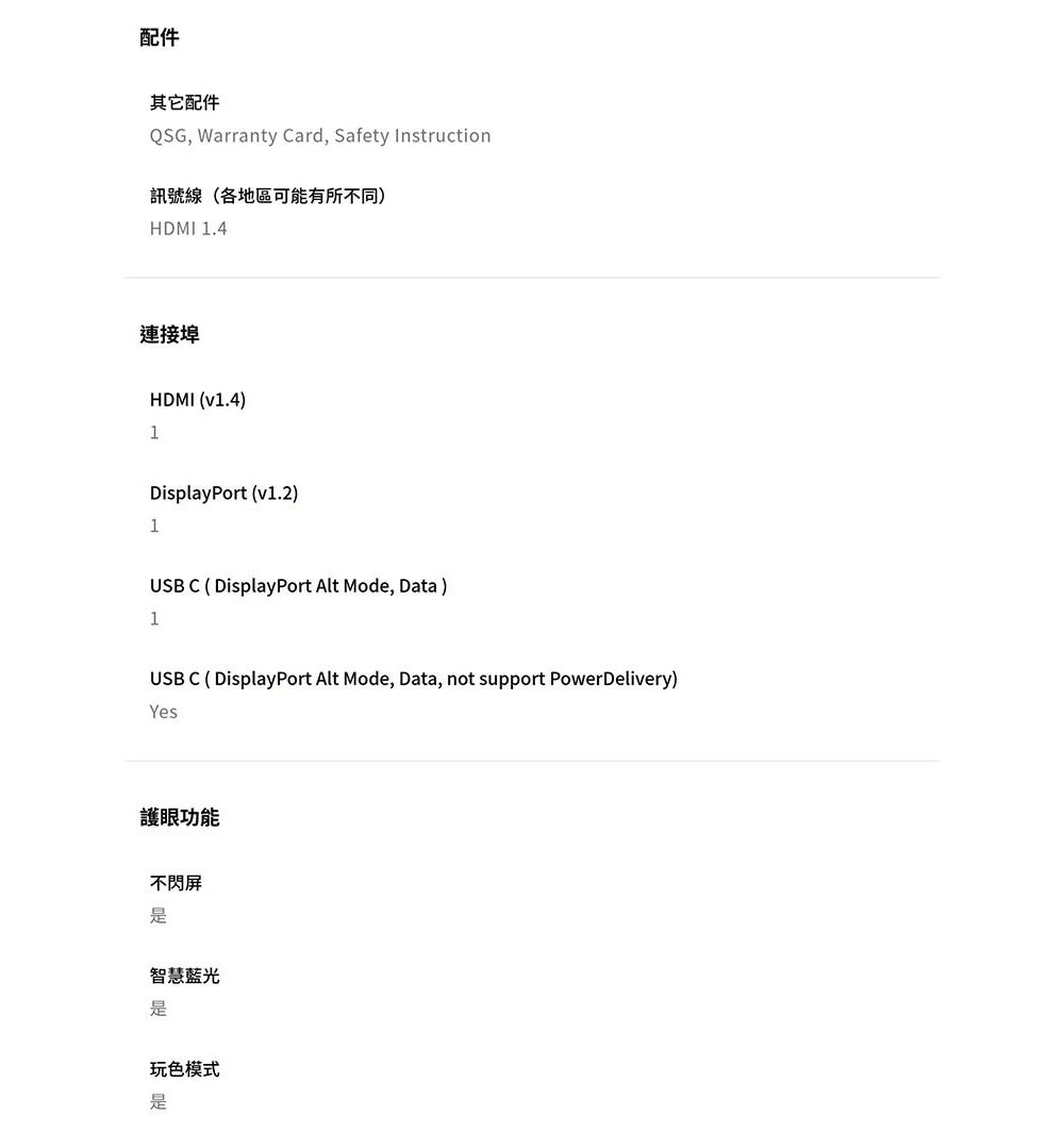 | 訊號輸入介面 | HDMI, Type-C, DisplayPort(DP) |