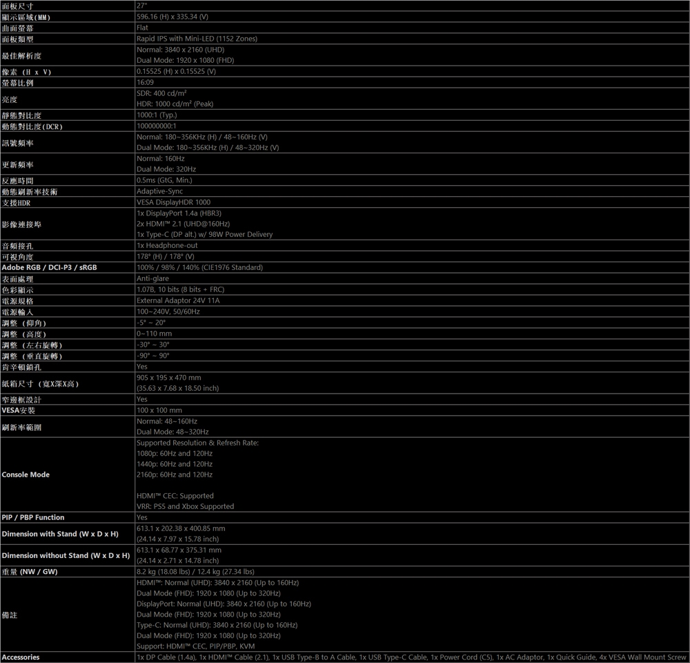 | 訊號輸入介面 | HDMI, DisplayPort(DP), Type-C |