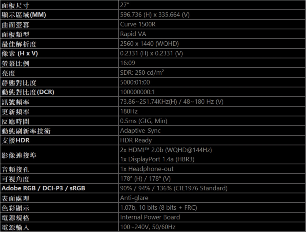 | 產品定位 | 看片/追劇首選, 電競Gamer必買, 曲面全景視覺, 健康護眼款 |