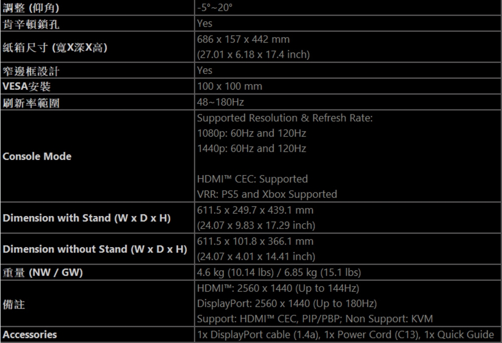 | 訊號輸入介面 | HDMI, DisplayPort(DP) |